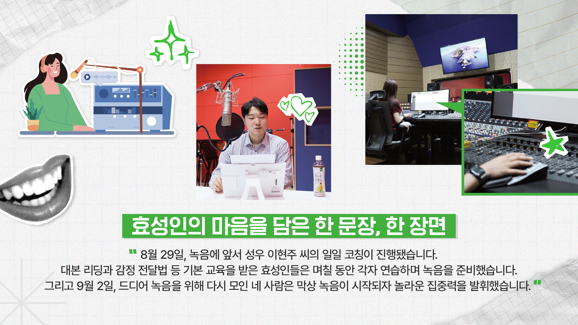 8월 29일, 녹음에 앞서 성우 이현주 씨의 일일 코칭이 진행됐습니다. 대본 리딩과 감정 전달법 등 기본 교육을 받은 효성인들은 며칠 동안 각자 연습하며 녹음을 준비했습니다. 그리고 9월 2일, 드디어 녹음을 위해 다시 모인 네 사람은 막상 녹음이 시작되자 놀라운 집중력을 발휘했습니다.