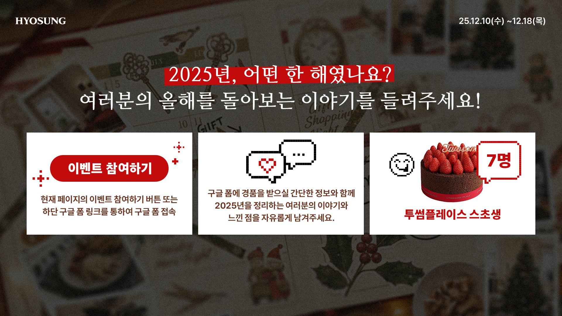 여러분의 ‘올해 이야기’를 들려주세요! 어느덧 한 해의 끝자락입니다. 바쁜 일상 속 잠시 멈춰 서서, 나의 성과, 변화, 아쉬움, 그리고 배운 점을 돌아보는 시간 2025년을 의미 있게 마무리할 수 있도록 함께하는 연말 참여 이벤트를 준비했습니다.