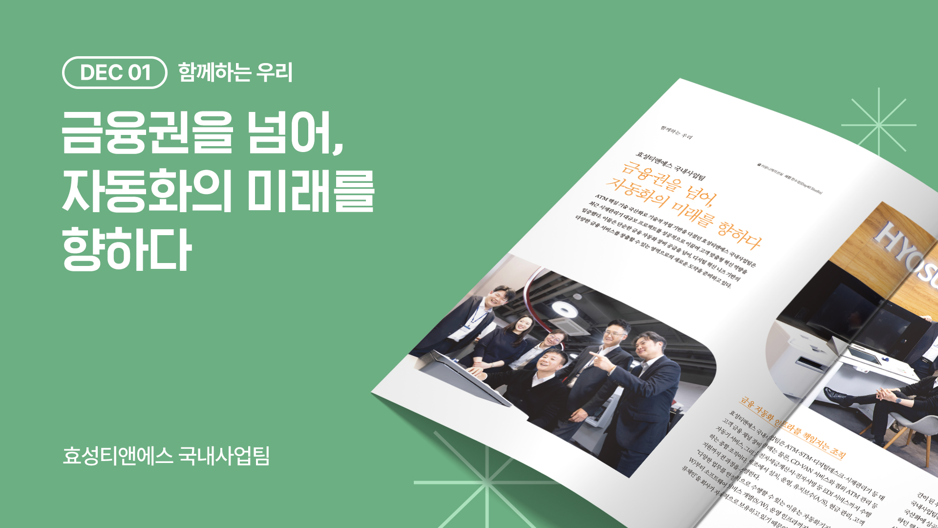 ATM 핵심 기술 국산화로 기술적 자립 기반을 다졌던 효성티앤에스 국내사업팀은 최근 시재관리기 대규모 프로젝트를 성공적으로 이끌며 고객 맞춤형 혁신 역량을 입증했습니다. 이들은 단순한 금융 자동화 장비 공급을 넘어, 디지털 혁신 니즈 기반의 다양한 금융 서비스를 창출할 수 있는 영역으로의 새로운 도약을 준비하고 있습니다.