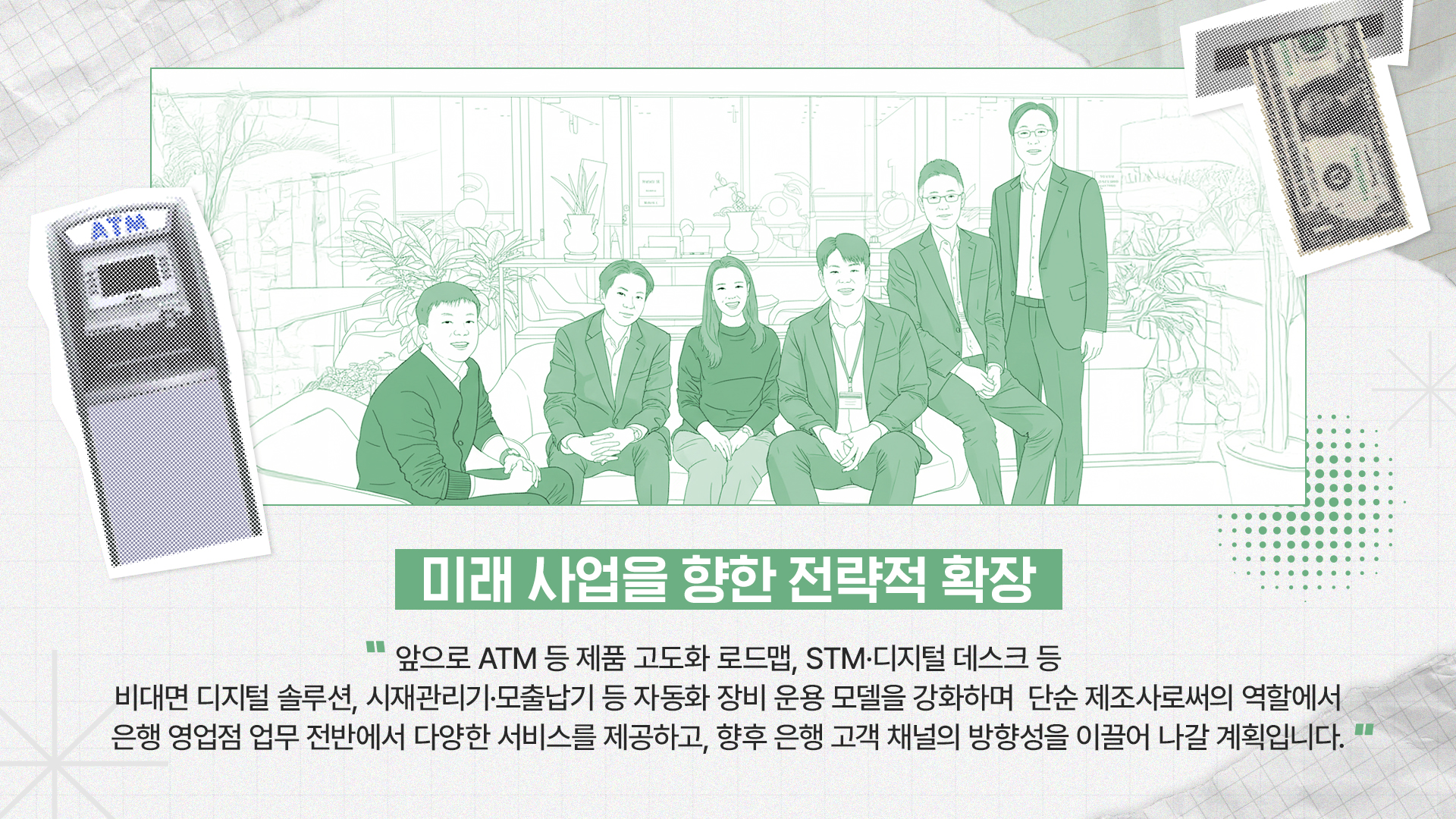 “국내사업팀은 ATM 중심 사업을 넘어, 변화하는 금융 환경 전체를 설계하는 조직으로 진화하고 있습니다. 앞으로 ATM 등 제품 고도화 로드맵, STM·디지털 데스크 등 비대면 디지털 솔루션, 시재관리기·모출납기 등 자동화 장비 운용 모델을 강화하며 단순 제조사로써의 역할에서 은행 영업점 업무 전반에서 다양한 서비스를 제공하고, 향후 은행 고객 채널의 방향성을 이끌어 나갈 계획입니다.”