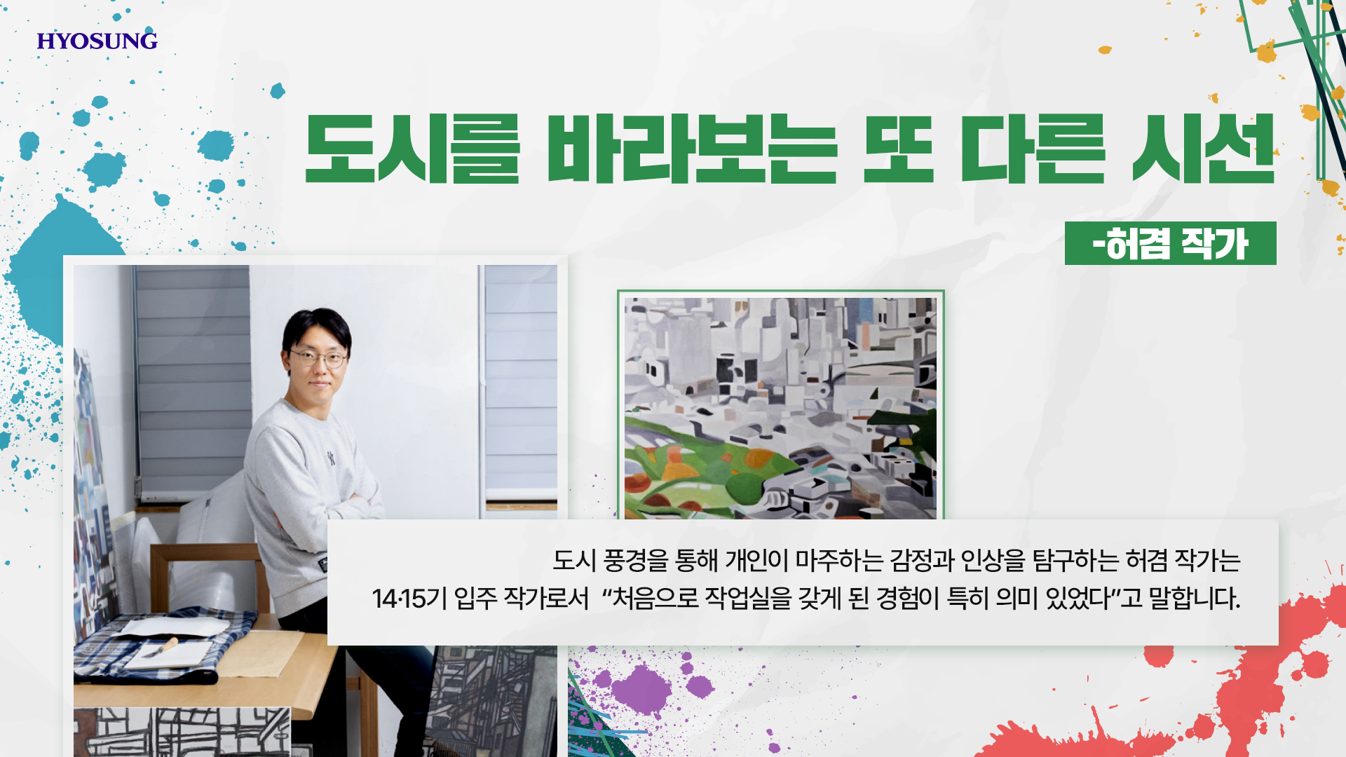 허겸 작가는 원래 인물을 그렸으나 대학 졸업 무렵 멀리서 본 도시의 풍경에 매료되어 원경 시리즈를 시작했습니다. 하나의 덩어리처럼 보이는 도시의 모습에서 새로운 영감을 찾은 것이죠. 그는 효성의 지원을 통해 전시 참여뿐 아니라 비평가 매칭, 포트폴리오 지도 등 실질적인 도움을 받으며 활동의 폭이 넓어졌다고 밝혔습니다. 요즘은 도시를 더 깊이 들여다보는 작업, 특히 ‘창문’을 소재로 한 새로운 시도를 구상 중입니다.