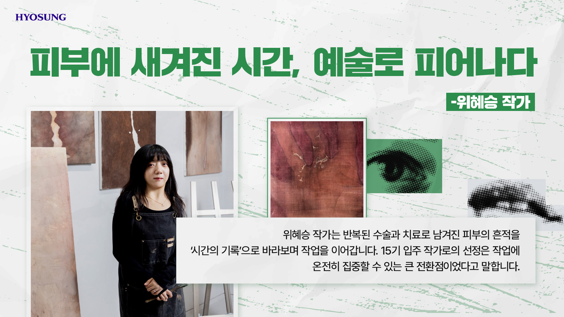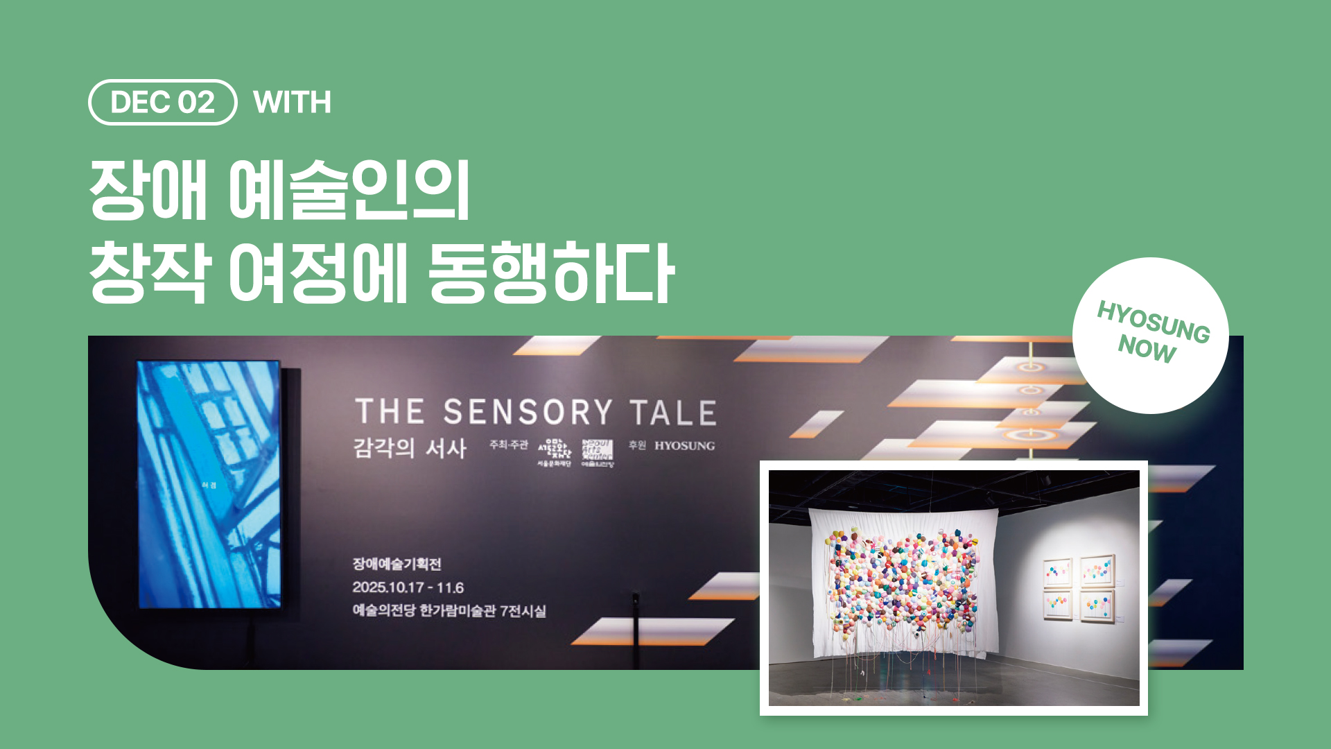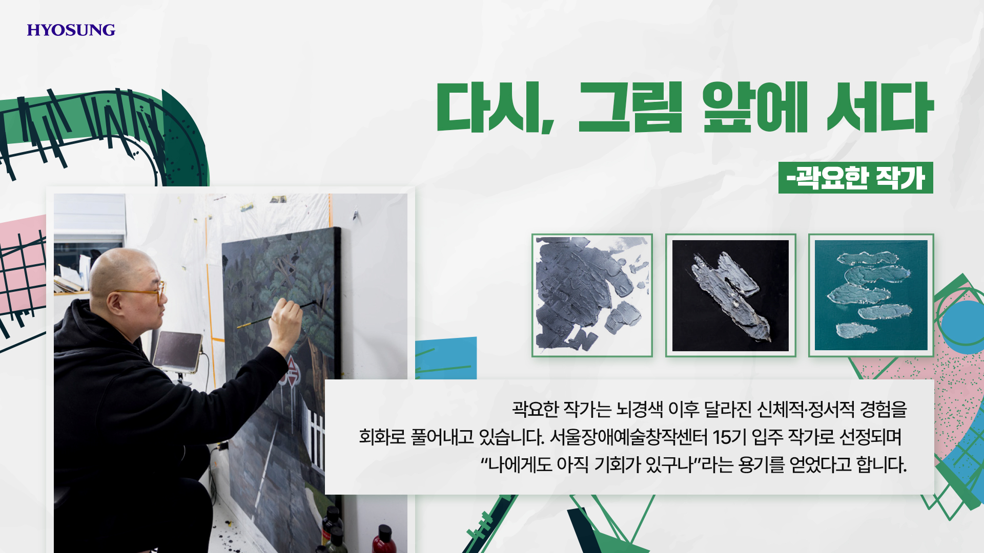 다양한 감각과 시선으로 세상을 기록하는 여섯 명의 작가들. 그들의 이야기는 예술이 개인의 경험을 넘어 사회와 연결되는 순간을 보여줍니다. 효성은 앞으로도 장애 예술인이 안정적으로 창작 활동에 매진하고, 더 넓은 무대에서 자신의 세계를 펼칠 수 있도록 곁에서 함께하겠습니다.