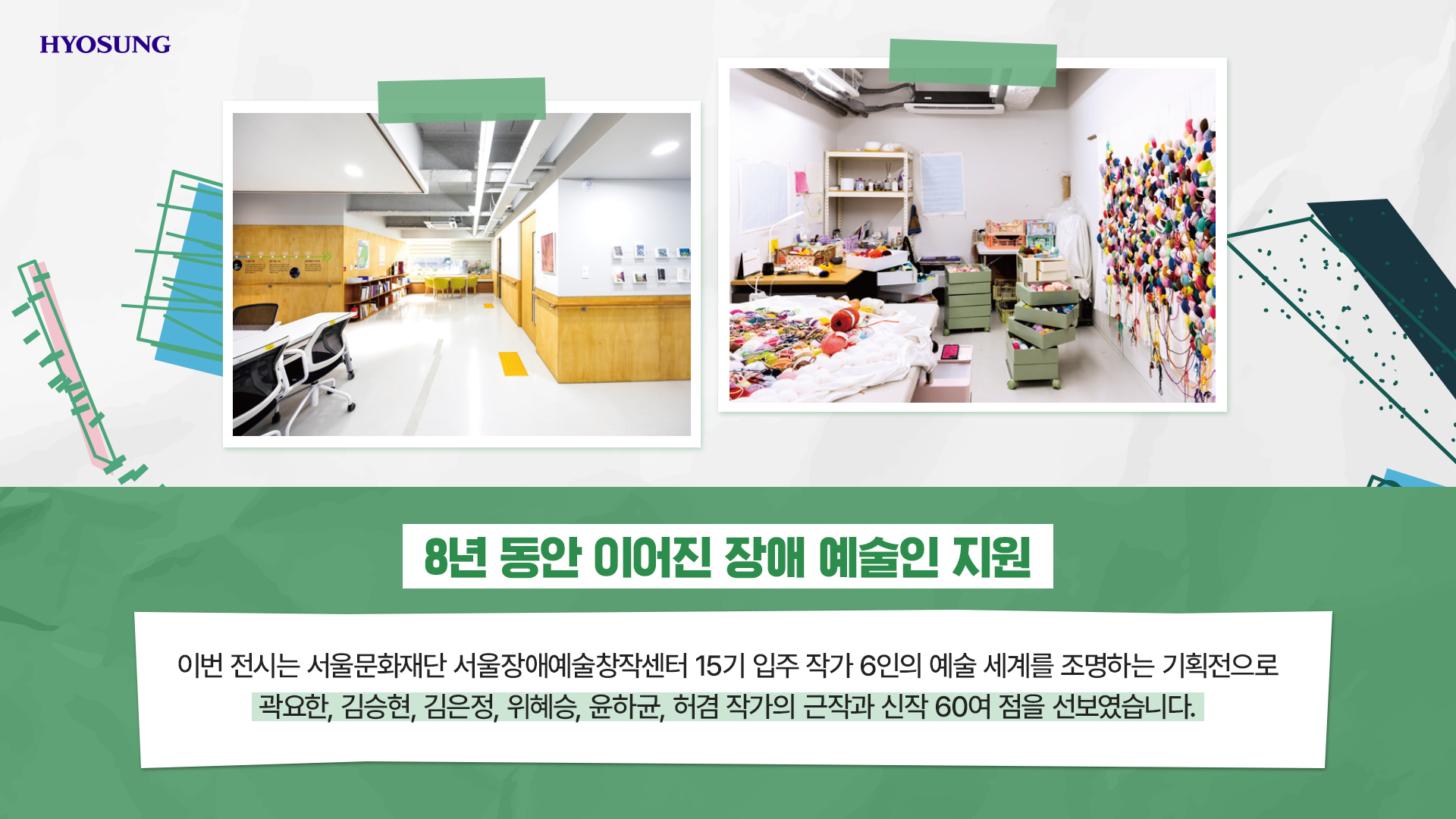 전시 기간에 많은 관람객들이 찾아와 높은 관심을 보였으며, 효성은 후원사로서 이번 전시를 위해 아낌없는 지원을 펼쳤습니다. 효성은 2018년부터 8년째 서울문화재단 서울장애예술창작센터와 함께 장애 예술인의 창작 활동을 꾸준히 후원해 오고 있습니다. 올해 후원금은 15기 입주 작가 6인의 안정적인 창작 활동을 위한 아티스트피와 전시 기획, 홍보물 제작 등에 사용되었습니다.