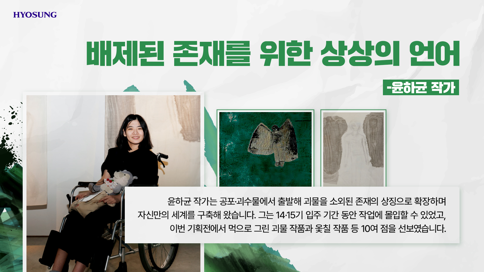그는 효성의 지원을 “작업 속도가 느린 장애 작가에게 실제적인 기반이 되어 준 소중한 기회”라고 말했습니다. 최근에는 ‘괴물 도상 연구와 조형 재료 탐구’라는 리서치를 하며, 기존과 다른 조형 재료들을 활용하는 새로운 작업을 시도하고 있습니다. 전시를 찾는 관람객들에게 “오길 잘했다”는 느낌을 주는 작품을 만들기 위해, 윤하균 작가는 오늘도 천천히 그러나 꾸준히 자신만의 작품 세계를 펼쳐나가고 있습니다.