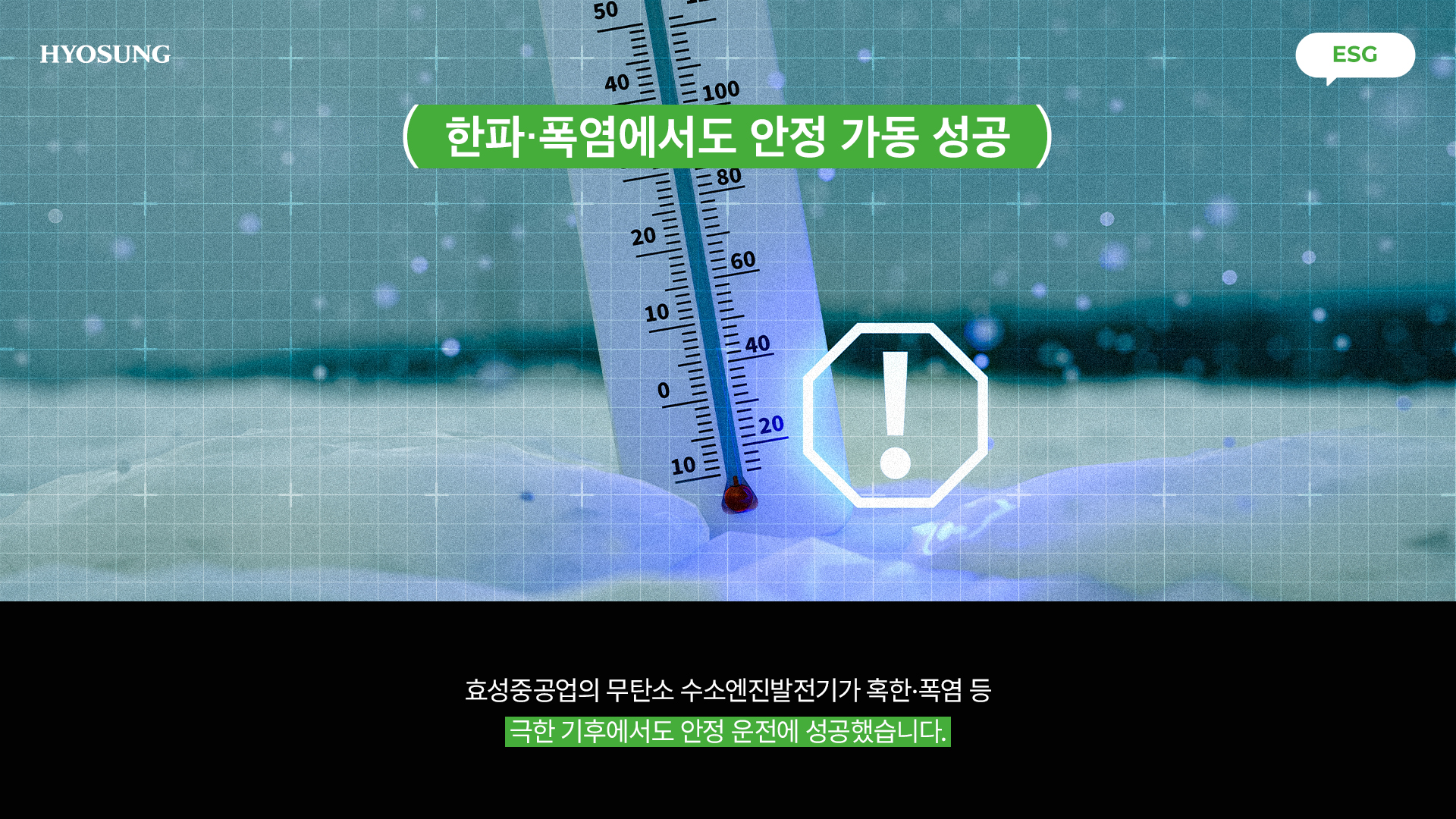 효성중공업의 무탄소 수소엔진발전기는 혹한과 폭염이라는 가장 까다로운 조건에서도 안정적인 운전에 성공했습니다.