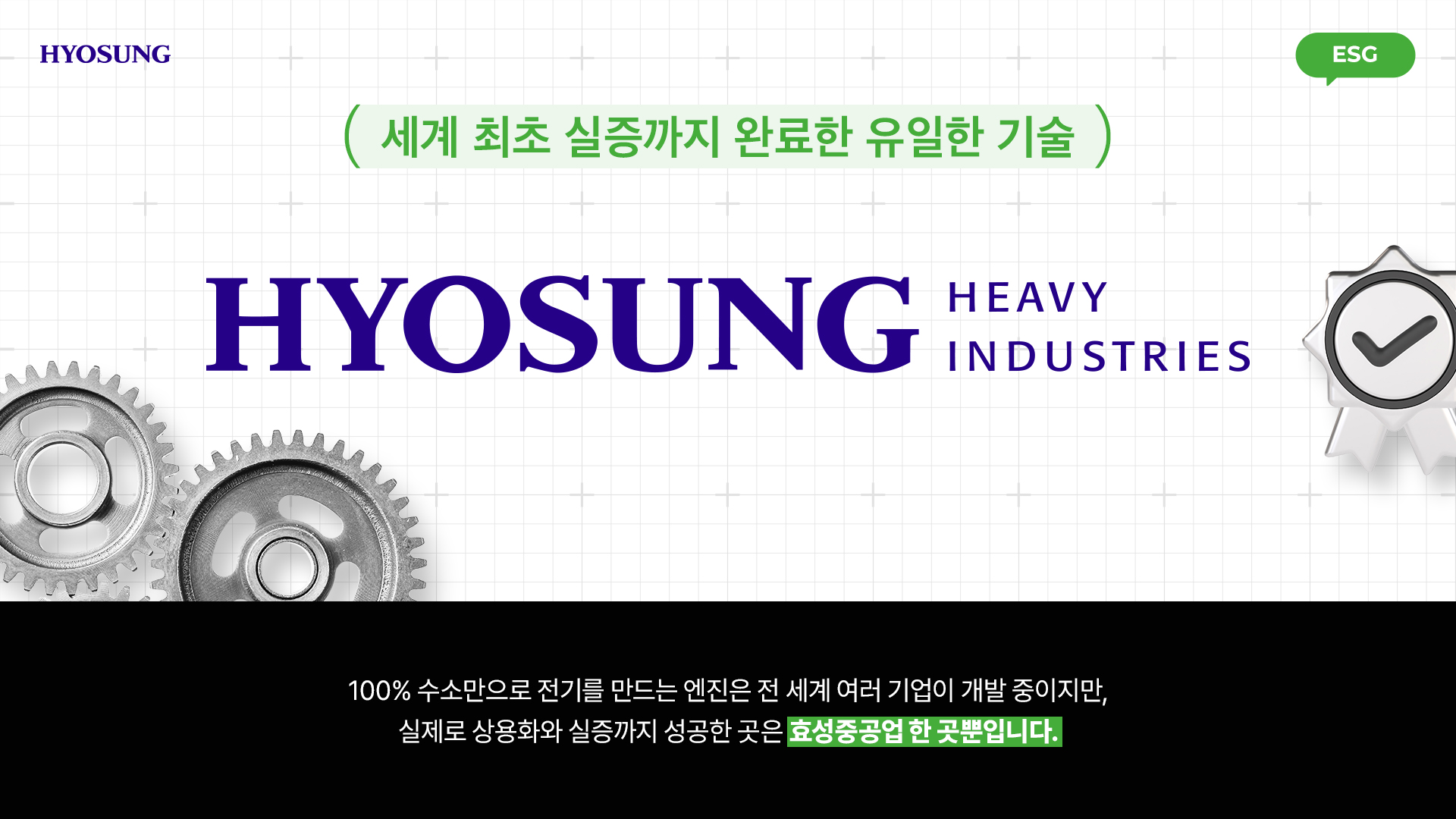 100퍼센트 수소만으로 전기를 만드는 엔진은 전 세계 여러 기업이 개발을 진행 중입니다. 하지만 실제로 현장에 적용해 실증까지 완료한 기업은 효성중공업이 유일합니다.