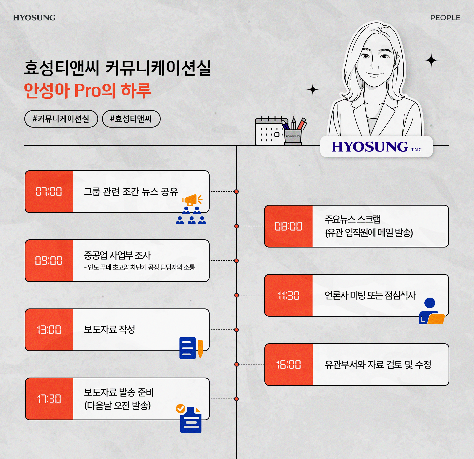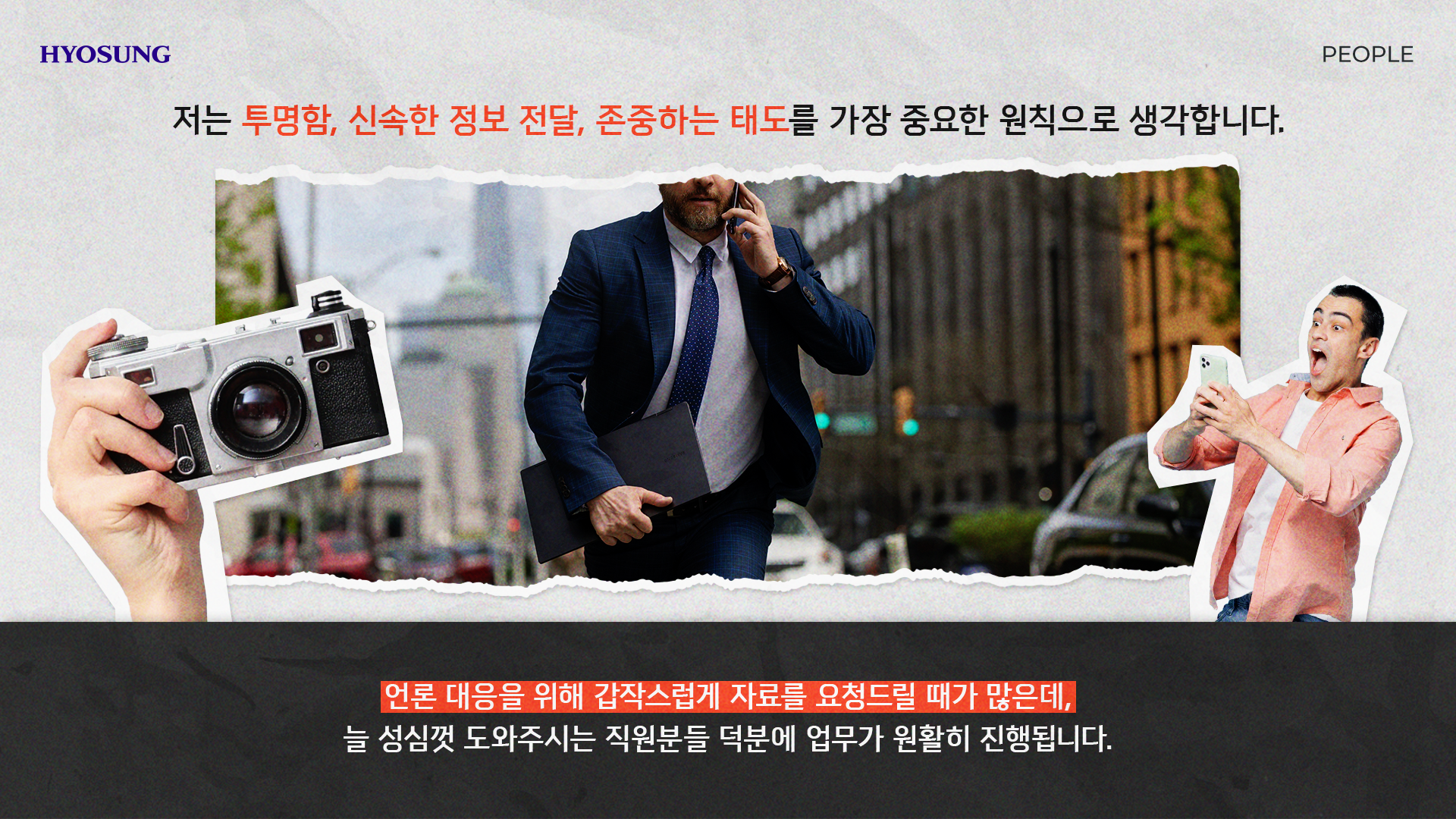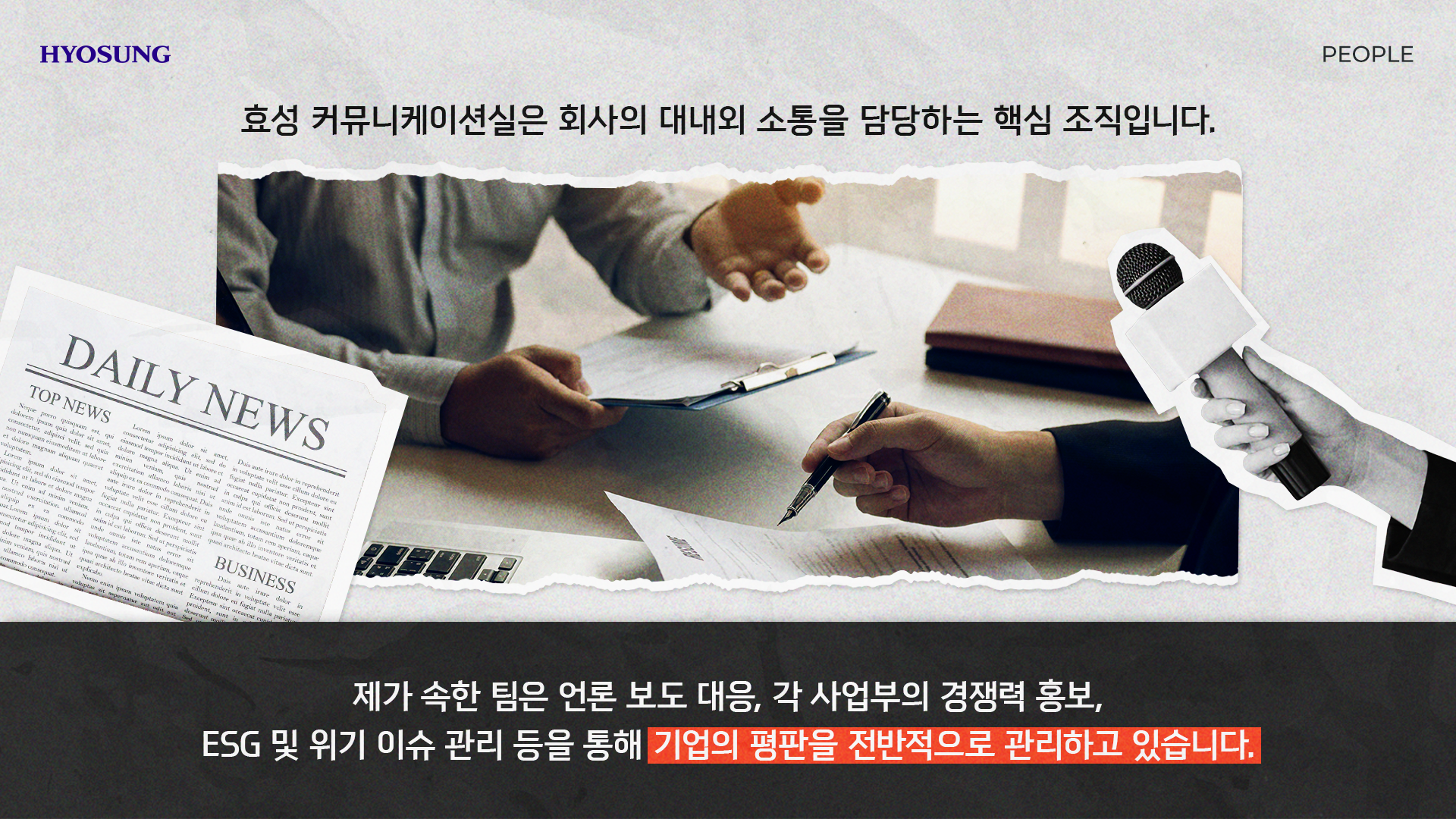 매일 수많은 뉴스가 쏟아지는 환경에서 효성의 기술력과 가치를 정확하게 전달하는 역할은 기업 이미지에 큰 영향을 줍니다.