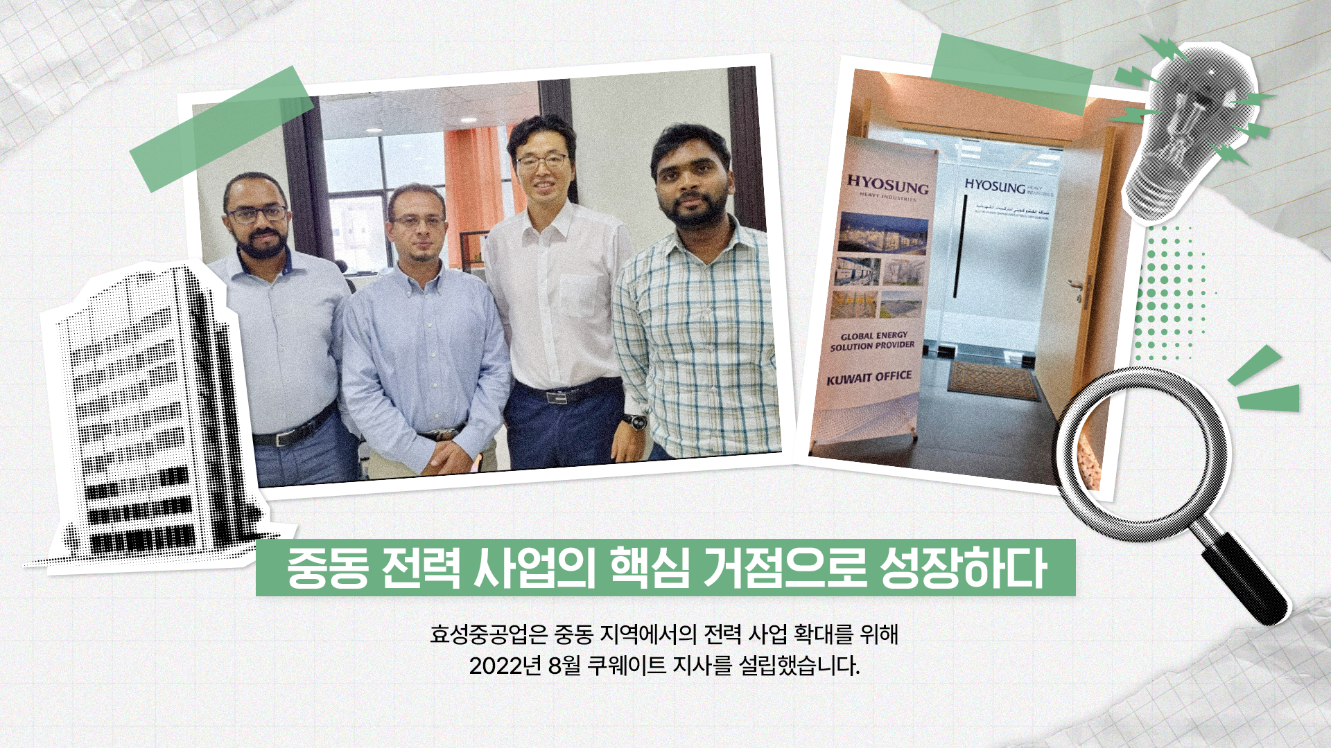 효성중공업은 중동 지역에서의 전력 사업 확대를 위해 2022년 8월 쿠웨이트 지사를 설립했습니다. 쿠웨이트시티에 위치한 지사는 주재원 2명과 현지 직원 3명 등 총 5명이 근무하고 있으며, 쿠웨이트는 물론 이라크, 튀르키예, 이집트 및 북아프리카 국가까지 담당하며 에너지 솔루션 제공의 전진 기지 역할을 수행하고 있습니다. 쿠웨이트와의 인연은 2000년 쿠웨이트 발전 사업에 참여하면서 시작됐습니다.