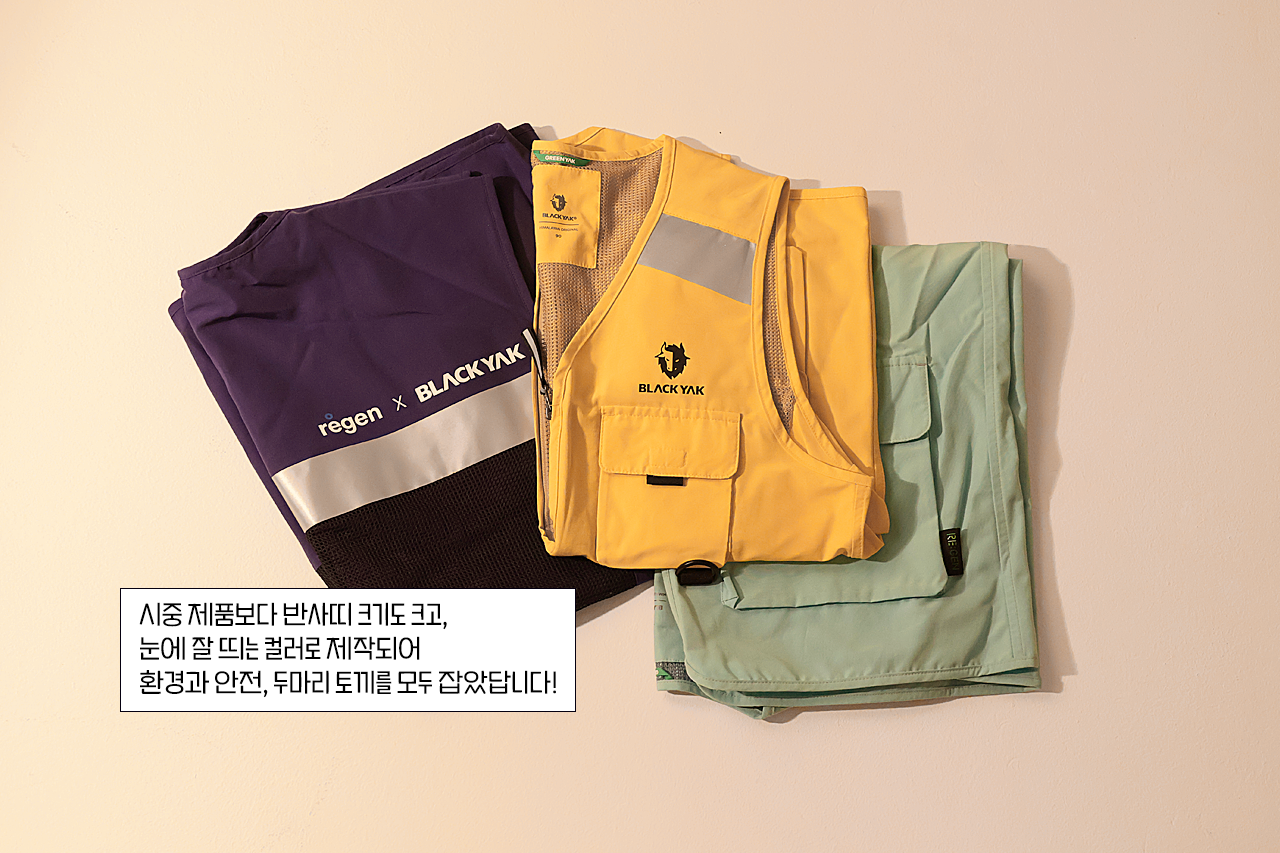 마지막으로 소개할 아이템은 블랙야크와 효성티앤씨가 협업해 만든 리젠 소재의 안전조끼입니다. 종종 현장 방문이 필요할 때가 있는 임직원들에게 안전조끼는 필수품인데요. 이 제품 역시 단순한 안전장비를 넘어선 의미가 있죠.