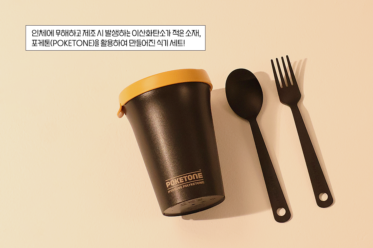 가방 안에는 일회용품 사용을 줄이기 위해 챙겨 다니는 수저와 포크, 그리고 텀블러가 있습니다. 작년에는 일회용 식기를 사용하면서 마음이 늘 불편했어서, 올해는 수저와 포크 정도는 챙겨보려고 해요! 혹시 사진을 보며 눈치챈 부분이 있으신가요? 바로 효성화학의 ‘포케톤(POKETONE)’ 소재라는 점!
