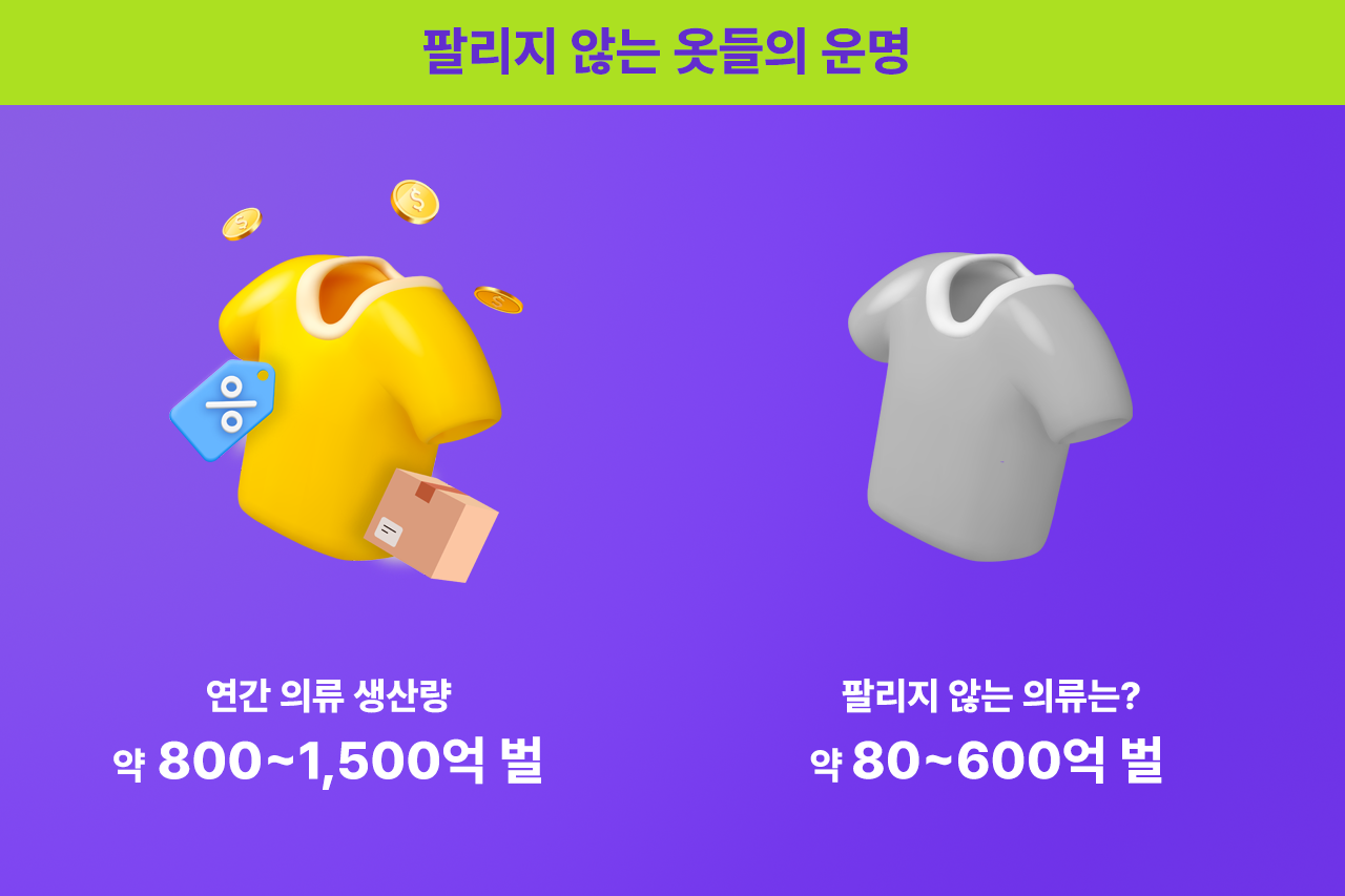 패션 업계의 기업 공시가 제한적인 만큼 정확한 수치를 파악하기는 어려우나, 추정치에 따르면 *전 세계적으로 연간 약 800억~1,500억 벌의 의류가 생산되고, 이 중 80억에서 600억 벌이 팔리지 않는 것으로 추측되고 있습니다.