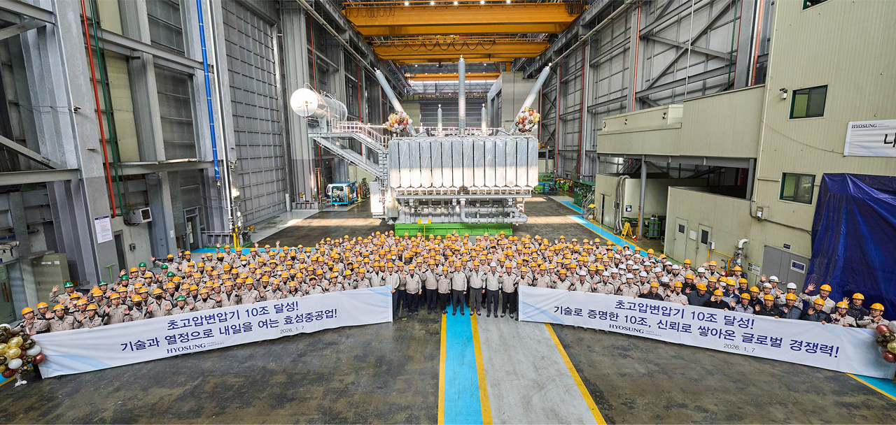 효성중공업 초고압변압기는 각 국가별 규격에 맞춘 설계 및 제작과 시험을 통해 전 세계 여러 국가의 고객들에게 공급되고 있으며, 지금까지 창원 공장에서만 7,500대 이상의 초고압변압기를 생산했습니다. 그 결과, 2002년에는 누적 생산 1조 원, 2014년에는 누적 생산 5조 원 돌파에 이어, 2026년 1월 국내 단일 공장 최초로 누적 생산 10조 원을 달성하는 성과를 거두게 됩니다. 이는 56년간 꾸준히 기술력과 품질 경쟁력을 바탕으로 한 효성중공업의 혁신의 결과라고 할 수 있습니다.