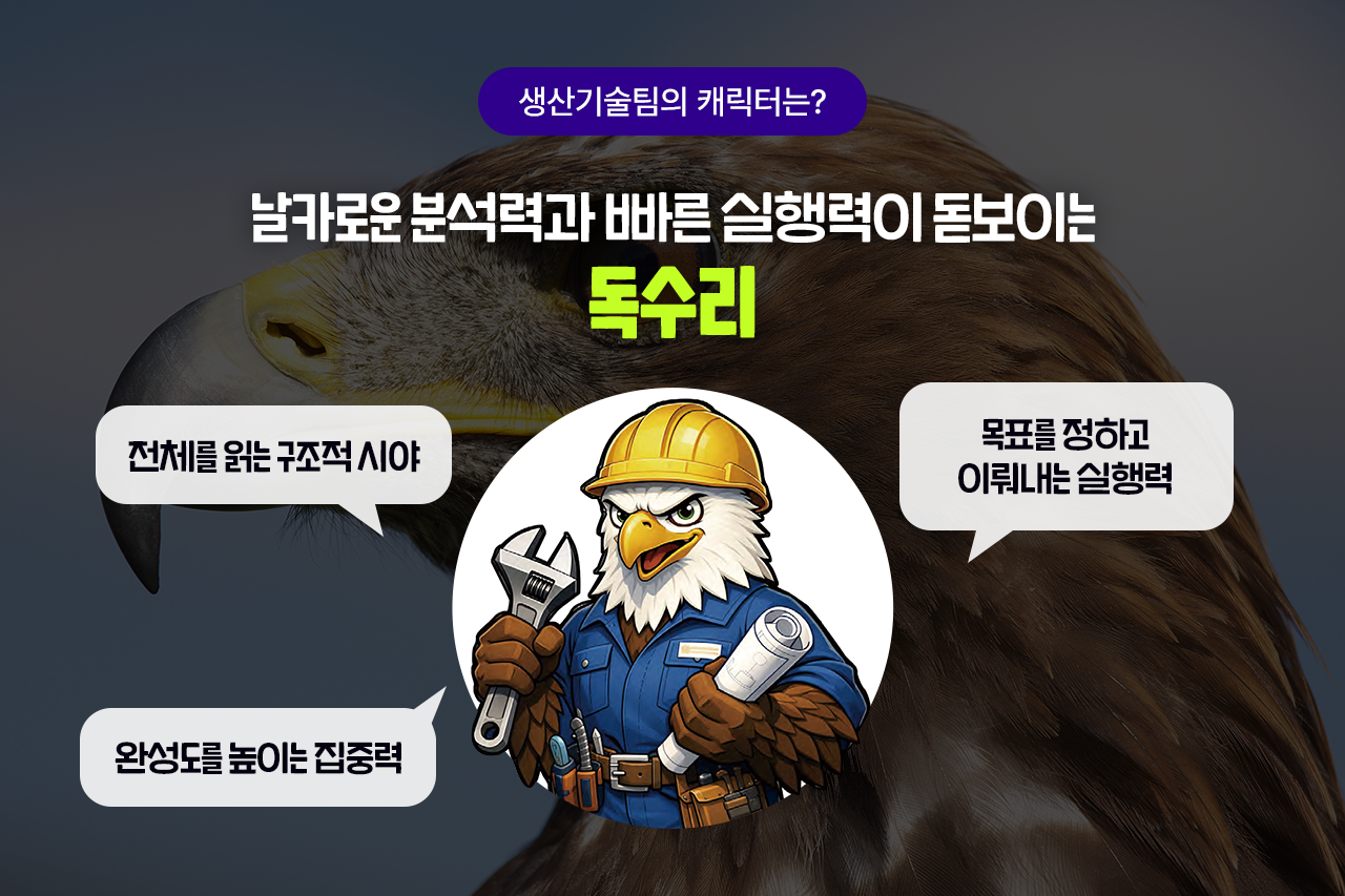 생산기술팀은 하나의 설비나 공정만 보는 팀이 아닙니다. 생산 현장에서 일어나는 흐름 전체를 읽고, 어디에서 비효율이 발생하는지, 어떤 요소가 품질과 생산성에 영향을 주는지 함께 살펴야 하는데요. 이런 점이 높은 하늘 위에서 전체 지형을 한눈에 파악하고 정확한 순간에 사냥을 성공하는 독수리와 닮지 않았나요?