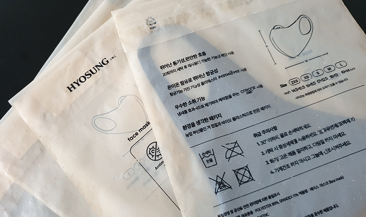 효성티앤씨와 안다르가 협업하여 만든 리업 페이스 마스크 패키지는 40% BIO-BASED + 60% BIO PLASTIC 성분의 칩으로 만든 썩어 없어지는 리사이클 폴리백으로 만들어졌습니다. BIO-BASED는 쌀겨를 갈아서 만든 성분이고 BIO PLASTIC은 플라스틱과 화학 물질을 결합하여 플라스틱이 빨리 썩을 수 있도록 만들어진 소재입니다. 플라스틱이 썩는 데에는 50년에서 몇백 년까지도 걸리지만, BIO PLASTIC은 5~10년 안에 썩어 없어집니다.