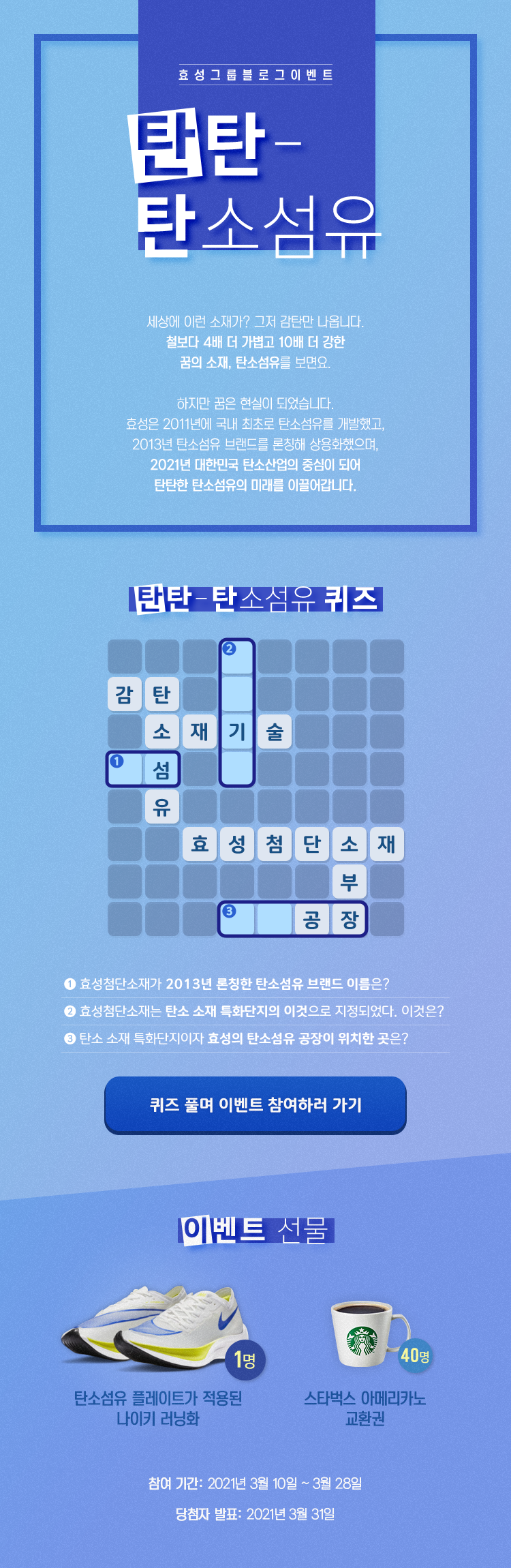 | [당첨자 발표] 탄탄한 탄소섬유의 미래, 효성 그리고 당신과 함께 (0) | 2021.03.31 |