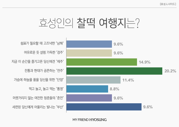 세 가지 질문을 통해 선호하는 여행 스타일을 알아보고 이에 어울리는 여행지를 추천하는 찰떡 여행지 테스트. 효성인들의 찰떡 여행지로 가장 많이 나온 곳은 바로 ‘전주’(20.2%)였습니다. 전통과 현대, 여유와 역동성이 공존하는 전주는 볼거리와 먹거리, 즐길거리가 가득해 추억 한가득 만들고 올 수 있는 곳이죠. 요즘 효성의 탄소섬유 공장으로 핫한 전주이기 때문일까요? 효성인들에게 더없이 잘 어울리는 전주입니다.