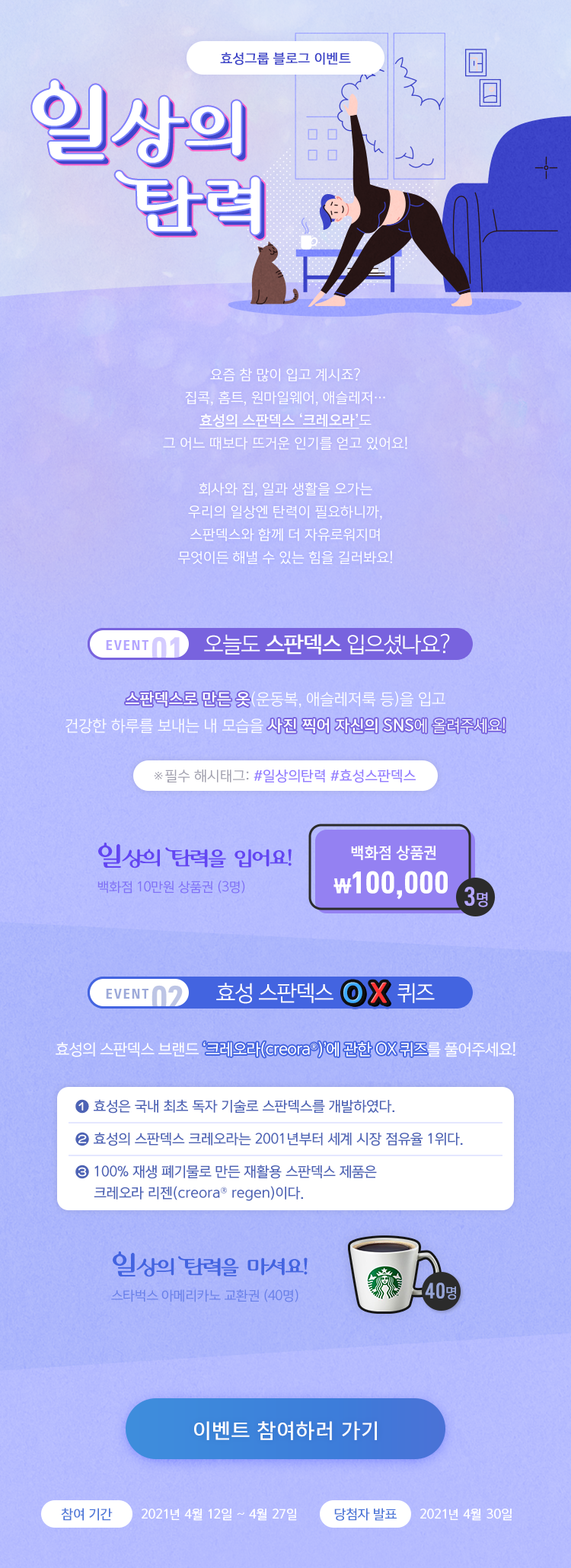 집에서든, 밖에서든, 일할 때도, 쉴 때도, 뛸 때도 스판덱스를 입는 시대입니다. 집콕할 일이 많아진 요즘, 홈트에 도전하려고 운동복이나 요가복을 사고, 동네를 돌아다닐 때도 입으려고 원마일웨어와 애슬레저룩도 찾게 됩니다. 여기에 빠질 수 없는 소재가 바로 스판덱스, 그리고 스판덱스 하면 바로 효성티앤씨가 만드는 세계 1위 스판덱스 브랜드 ‘크레오라(creora®)’입니다. 여러분의 일상에 탄력을 더해주는 크레오라와 함께 <일상의 탄력> 이벤트에 참여해보세요!