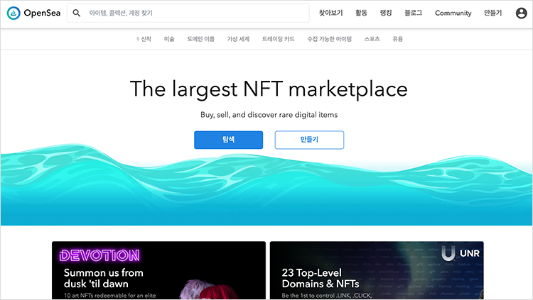 전 세계에서 가장 큰 NFT 마켓플레이스인 오픈씨(OpenSea)에 접속해보면 미술품, 도메인 이름, 가상 세계, 트레이딩 카드, 수집 가능한 아이템, 스포츠 등 다양한 NFT들을 만나볼 수 있어요.