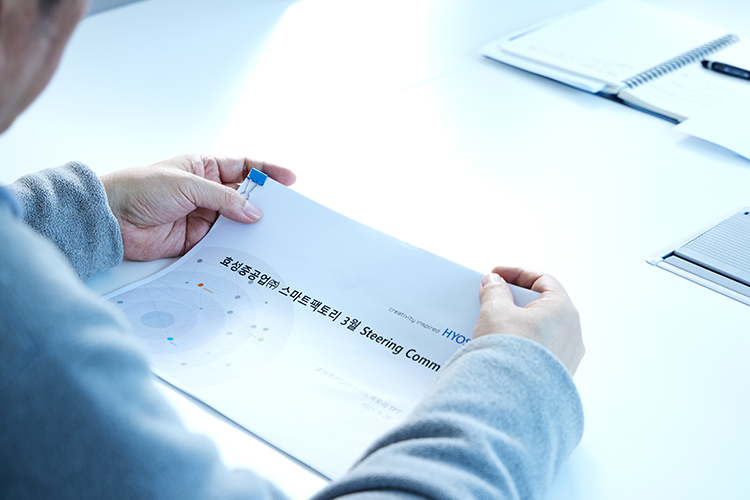효성그룹은 제조 환경의 경쟁력을 강화하기 위해 제조 공정과 품질을 관리하는 ‘스마트 팩토리 활동’을 지속적으로 추진해왔습니다. 스마트 팩토리는 생산 과정의 단순 자동화 차원을 넘어 맞춤형 생산부터 제품 생애 주기 관리까지 다양한 기능이 포괄된 개념을 뜻하죠. 이처럼 IT 기술을 활용해 공장 데이터를 자산화하고, 지능형 생산 공장으로 거듭나기 위해 효성그룹은 2020년부터 PU별 스마트 팩토리 전담 팀을 꾸려 현장의 스마트 팩토리 과제를 함께 수행 중입니다.