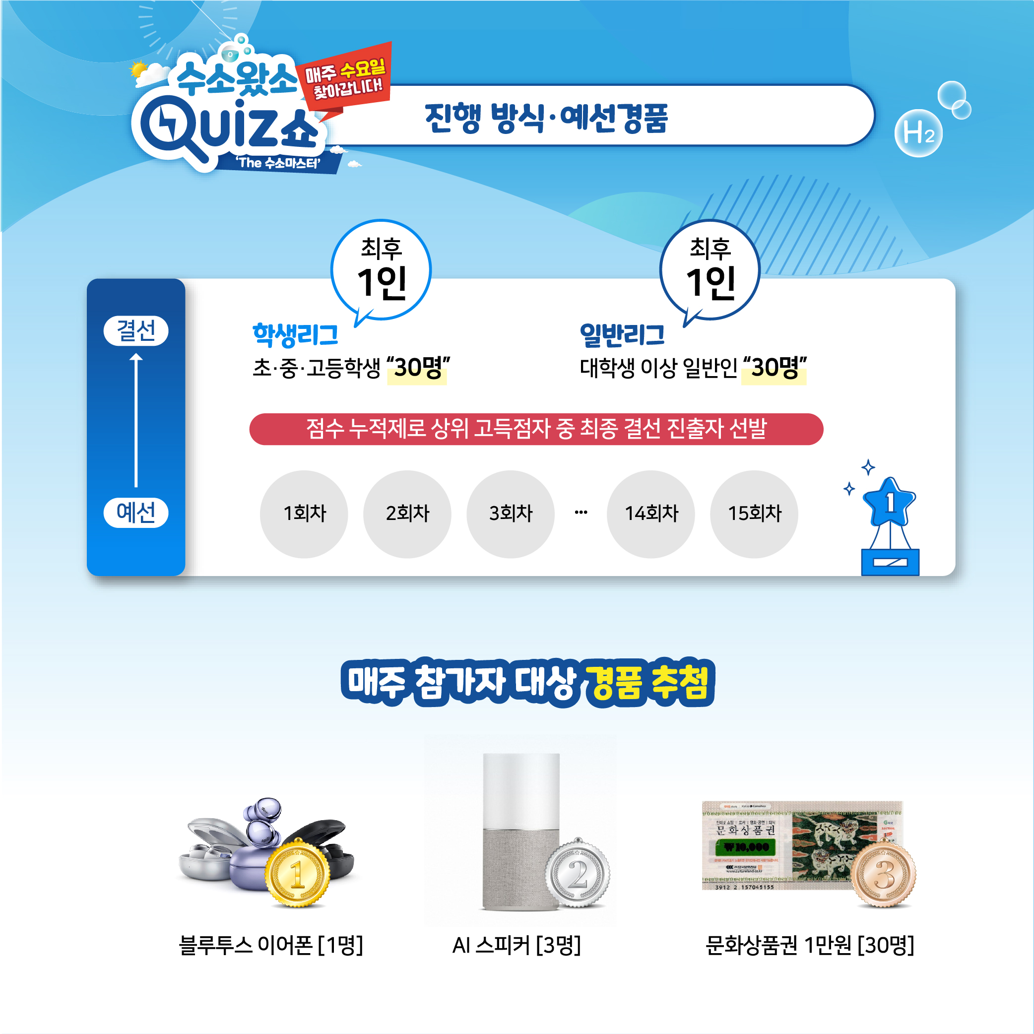 <수소왔소 퀴즈쇼>는 매주 수요일에 열리는 온라인 예선을 총 15회 진행한 후에 점수 누적제로 상위 고득점자 중 최종 결선 진출자를 선발하게 됩니다. 매주 참가자를 대상으로도 추첨을 통해 푸짐한 경품을 드리고 있고, 결선 최종 1등에게는 수소전기차 및 산업부 장관상을 수여합니다.