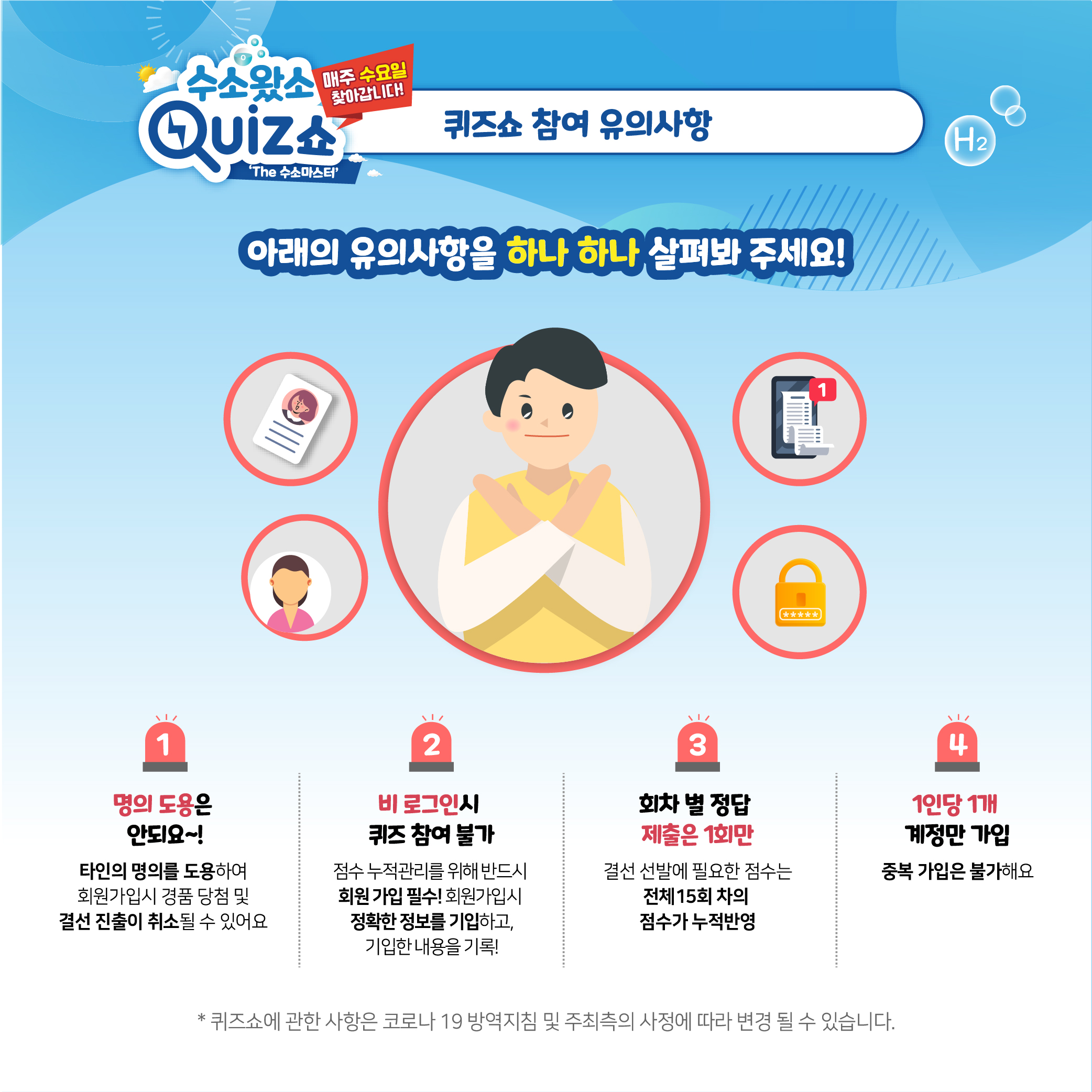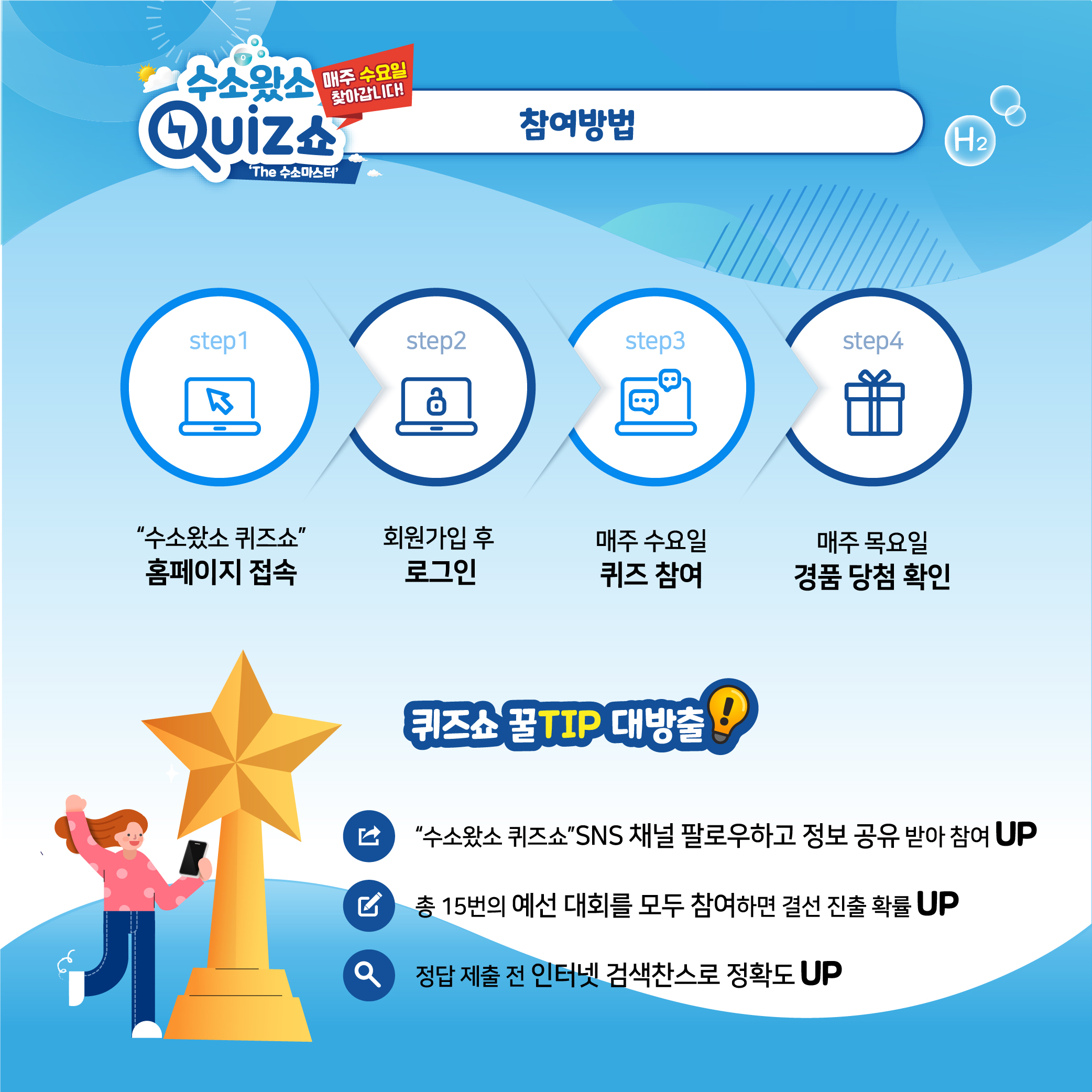 참여방법은 아주 간단해요. <수소왔소 퀴즈쇼> 홈페이지에 접속하여 회원가입 후 로그인하고, 매주 수요일 12시부터 21시까지 열리는 퀴즈에 참여하시면 됩니다. 예선 경품 당첨과 정답은 매주 목요일에 공개되고요.