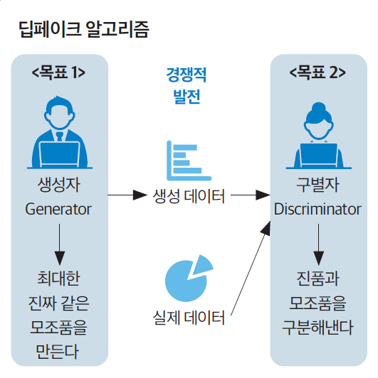 딥페이크 사진이나 동영상을 만들기 위해서는 AI에게 수백, 수천 개의 이미지를 학습시켜 특정 얼굴이나 패턴을 인식하는 훈련 과정을 거칩니다. 여기에는 ‘생성자’와 ‘감별자’라는 두 알고리즘이 사용되는데요, 생성자 알고리즘이 이미지를 만들면 감별자는 이 이미지가 가짜인지 진짜인지를 판별합니다. 그리고 이 과정을 계속 반복하면서 두 알고리즘이 서로 경쟁하듯 차이점을 분석하고 학습하면 점점 더 정교한 가짜 이미지를 만들어낼 수 있게 됩니다. 경찰이 진짜 지폐와 위조지폐를 구별해 범인을 잡으면 위조지폐범이 경찰의 눈을 속이기 위해 더욱 정교한 위조지폐를 만드는 방식과도 비슷합니다.