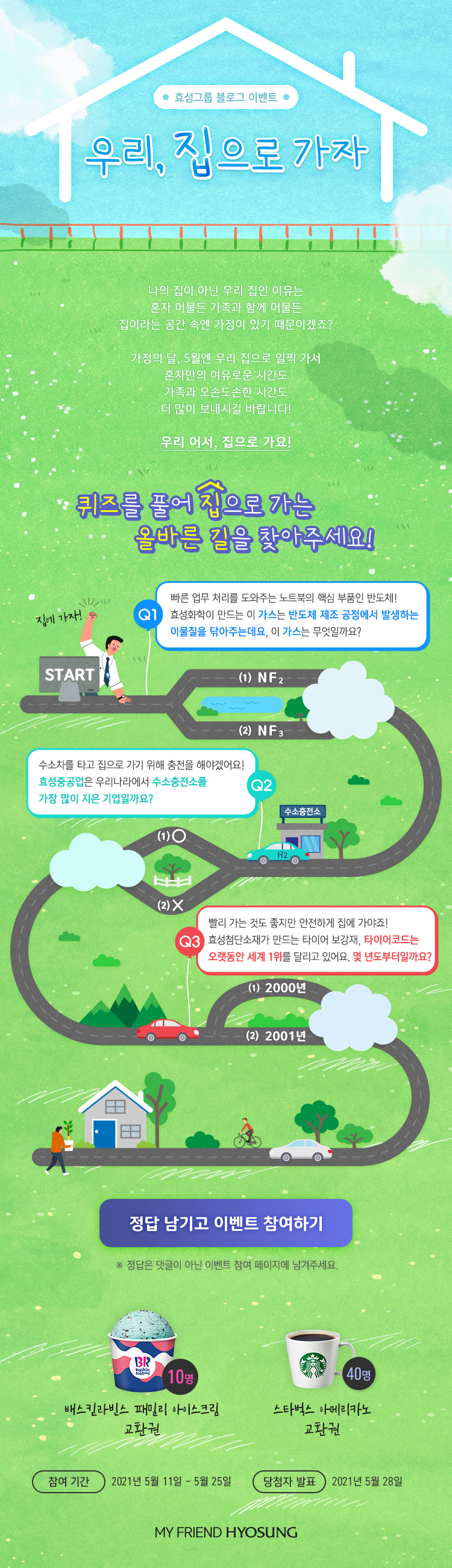 집으로 가는 길은 설레진 않지만 발걸음이 빨라집니다. 익숙하고, 편안하고, 때론 그리운 우리 집. 가정의 달 5월엔 우리 떠 빨리 집으로 가서, 더 많은 시간을 보내봐요! 혼자 사는 집도, 가족과 함께 사는 집도, 결국 우리 집이 최고니까요. <우리, 집으로 가자> 이벤트에 참여하며, 집으로 가는 길에 만나는 효성의 기술과 제품에 관한 퀴즈를 풀어 오늘도 무사히 집으로 향해봐요!