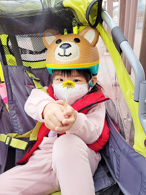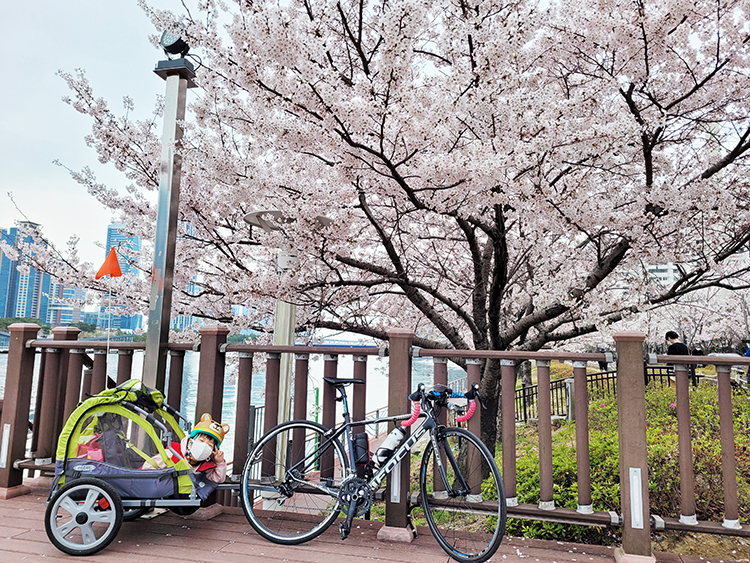 아이와 벚꽃 라이딩을 했습니다. 아이는 트레일러에 타고, 제가 자전거로 끌면서 부산 수영강변에 핀 벚꽃을 구경했어요. 쉬는 도중에 민들레 꽃을 보고는 엄마한테 예쁜 꽃을 주고 싶다며 사진도 한 컷 남겼습니다.