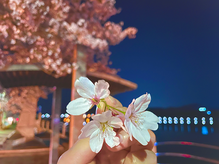 벚꽃이 만개할 무렵, 퇴근 후 회사 선배와 구미공장 옆 낙동강 산책로를 걸었습니다. 어두운 밤에 활짝 핀 벚꽃이 가로등에 비쳐서 정말 예뻤어요! 코로나 때문에 꽃놀이를 가지 못했지만 가까운 곳에서 즐거운 시간을 보낼 수 있어 기분이 좋았습니다.
