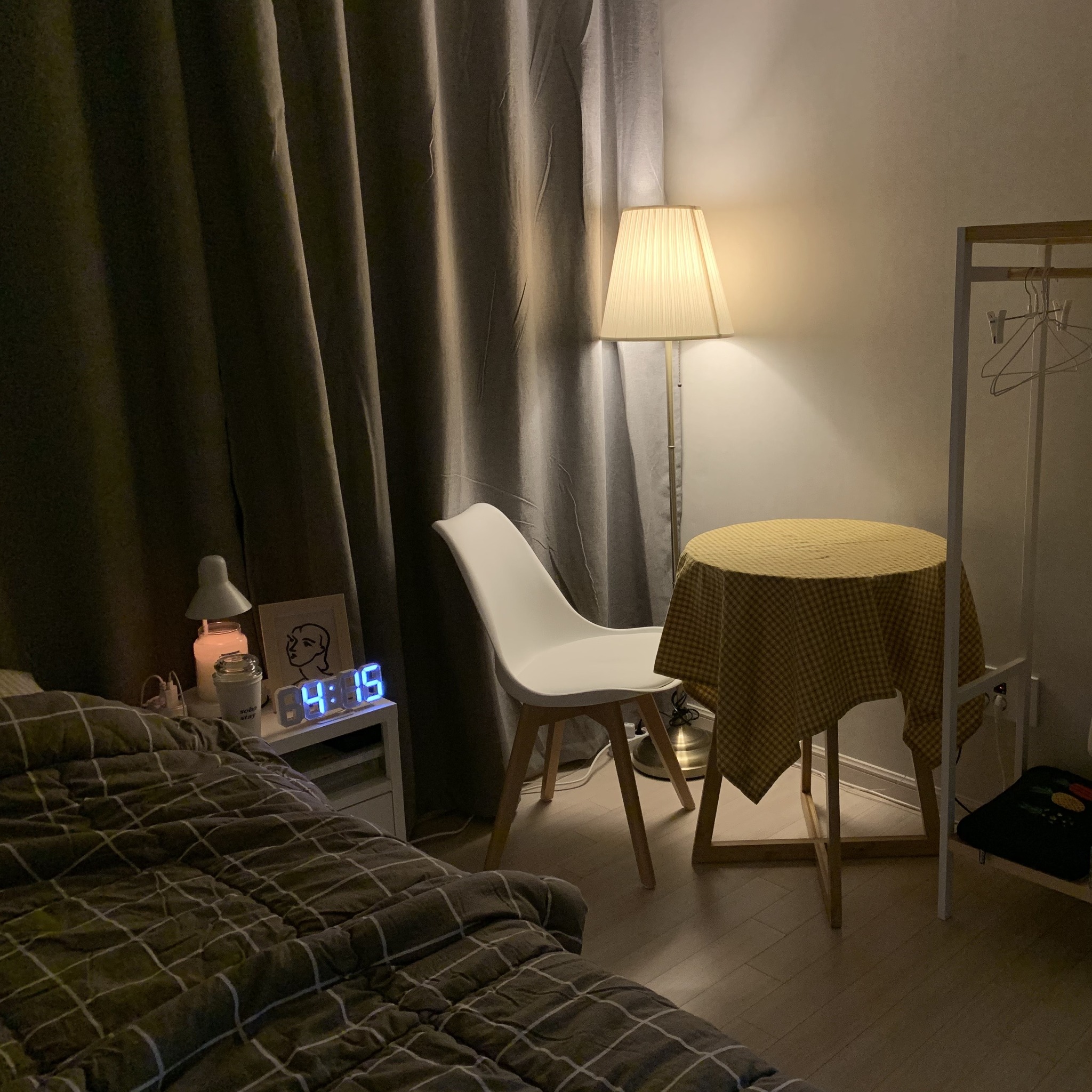 “주말 달콤한 늦잠을 위한 암막 커튼, 노트북 작업을 하며 간단히 커피를 즐길 수 있는 1인 테이블, 은은한 조명과 LED시계가 인테리어에 포인트를 주고 있습니다!”