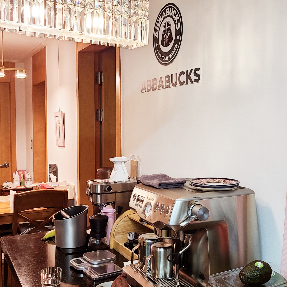 “아일랜드 식탁 한편에 홈카페를 마련하고, 벽면에 폼보드를 이용한 카페 간판을 붙여서 카페 느낌을 만들어봤습니다.”