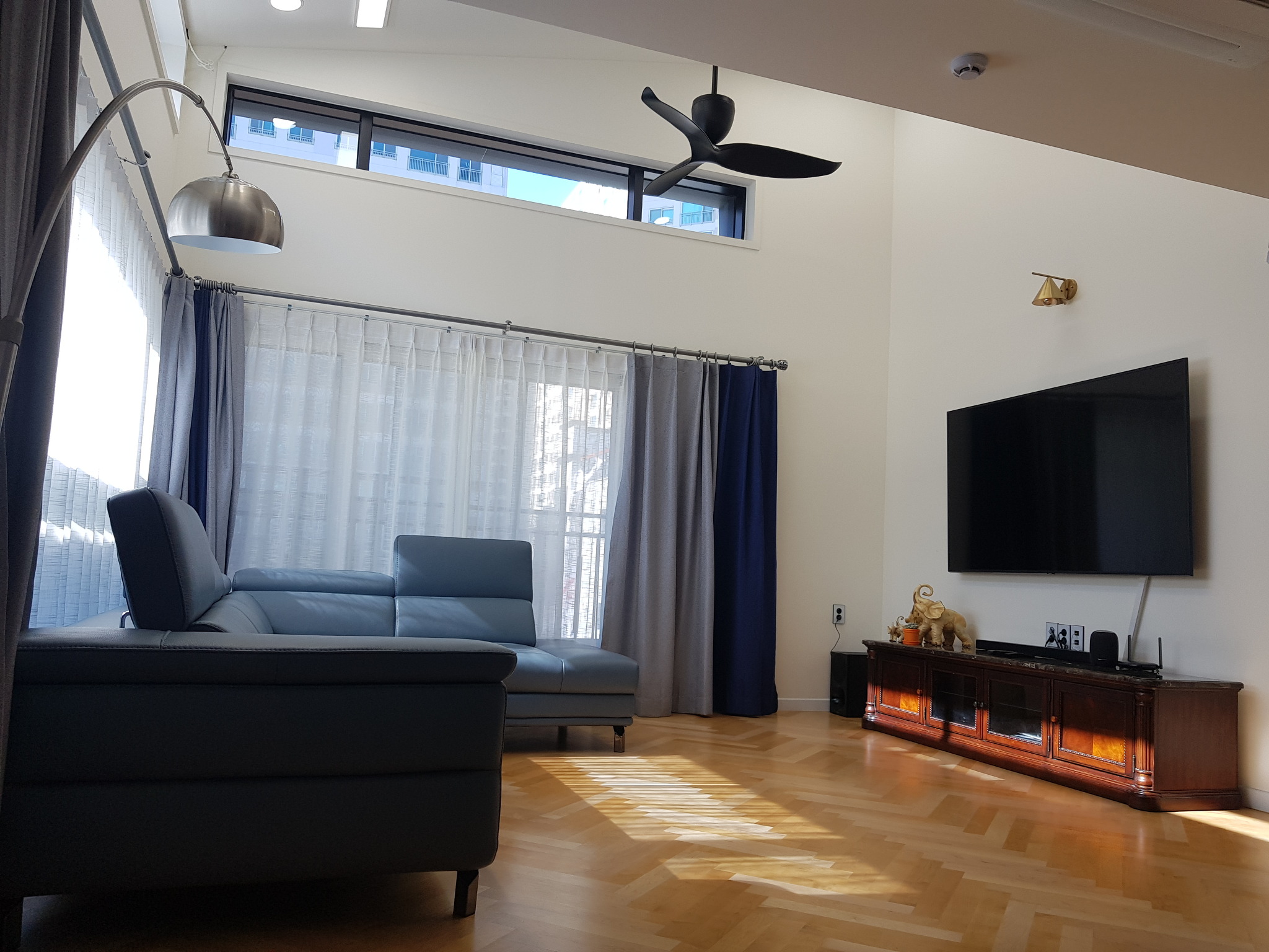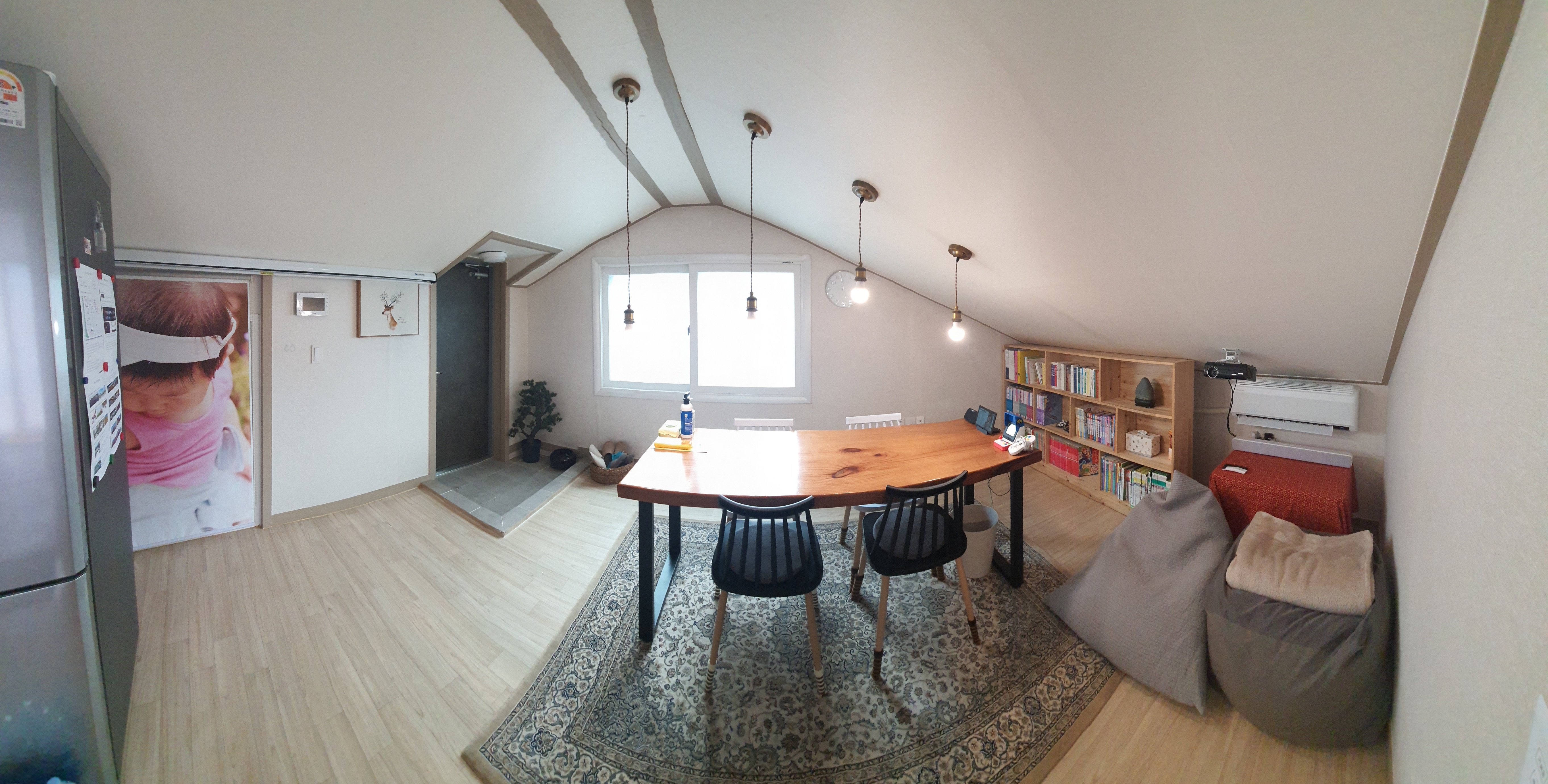“저희 집 복층 거실이에요. 아이들과 공부, 놀이를 위한 테이블을 중심으로 조명, 책장 등을 배치했고, 동영상 및 영화 관람을 위해 빔프로젝터 및 사운드바 등 전자 제품을 배치했습니다. 그리고 가장 신경 쓴 부분은 조명으로 책상 밑이나, 사운드바 근처에 간접 등을 설치하여 분위기 있는 공간이 될 수 있도록 노력했어요.”