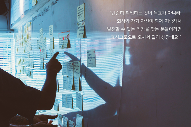 효성그룹은 안정적인 사업 포트폴리오와 전 세계에 퍼져있는 넓은 네트워크를 기반으로 직원들의 성장을 위해 아낌없이 투자하는 기업입니다. 단순히 취업하는 것이 목표가 아니라, 회사와 자기 자신이 함께 지속해서 발전할 수 있는 직장을 찾는 분들이라면 효성그룹으로 오셔서 같이 성장할 수 있었으면 좋겠습니다. 감사합니다!