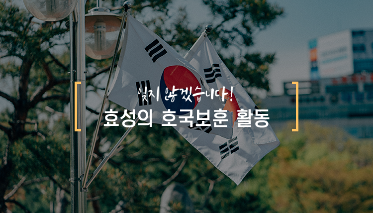 결코 잊을 수 없는 일들이 있는 반면, 잊지 않기 위해 끊임없이 노력해야 하는 일도 있습니다. 알고는 있지만 평소 신경쓰지 않으면 쉽게 잊어버리는 일, 현충일, 6•10민주항쟁, 6•25가 있는 6월은 특히나 더 그렇습니다. 지금의 한국 사회를 만들어준 누군가의 희생을 잊지 않기 위해 효성은 앞으로도 꾸준히 호국보훈 활동을 이어가겠습니다.
