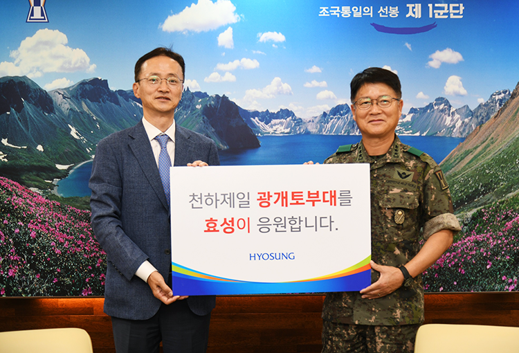 ‘1사 1병영 운동’은 군부대와 기업 간 1:1 자매결연과 상호교류를 통해 민(民)과 군(軍)의 유대를 강화하고자 시행해왔습니다. 군은 기업에게 신입사원 병영체험, 부대지휘관의 안보강연, 부대견학행사 등을 지원하여 직원들의 안보의식 및 소속감 고취에 도움을 주고, 기업은 군에게 취업지원 및 경제특강, 문화•복지 분야에 대한 지원을 통해 장병 사기 및 복지증진에 기여하게 되죠. 효성은 2010년 광개토부대와 1사1병영 자매결연 협정을 체결한 이후 매년 군부대 발전을 위한 군부대 발전을 위한 위문금과 위문품, 장병들을 위한 독서카페시설 등을 후원해오고 있습니다. 최근에는 위문금 1천만 원과 제습기 20대를 후원하였습니다.