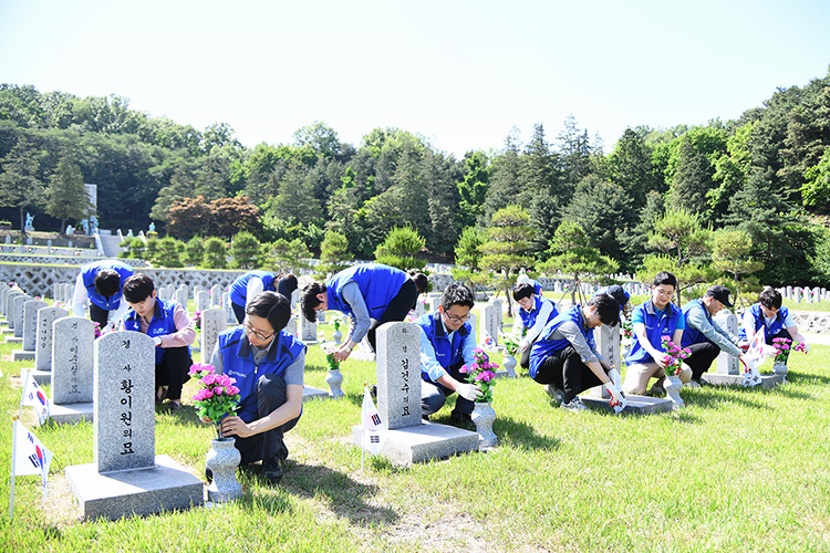 효성은 순국선열 희생정신을 기리기 위해 2014년부터 서울국립현충원, 국립대전현충원, 국립영천호국원 등 전국의 사업장 인근 국립묘지와 1사 1묘역 자매결연을 맺고 있어요. 효성 본사는 국립서울현충원 9묘역을, 충청지역의 7개 사업장은 국립대전현충원 403묘역을, 대구ㆍ경북지역 4개 사업장이 경상북도 영천시에 위치한 국립영천호국원 18구역을 담당하고 있죠. 연 2회 정기적으로 임직원들이 직접 묘비 닦기, 잡초 제거 등 정화활동을 실시하고 있습니다.