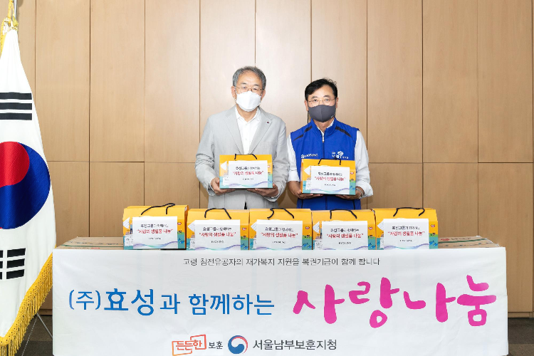 또한 '사랑의 생필품' 나눔으로 서울남부보훈지청에 등록된 국가유공자와 재가복지대상자에게 참치와 햄 200세트를 후원했습니다. 효성의 '사랑의 생필품' 나눔은 2015년부터 1년에 4번씩 취약계층과 국가유공자에게 전달하고 있습니다.