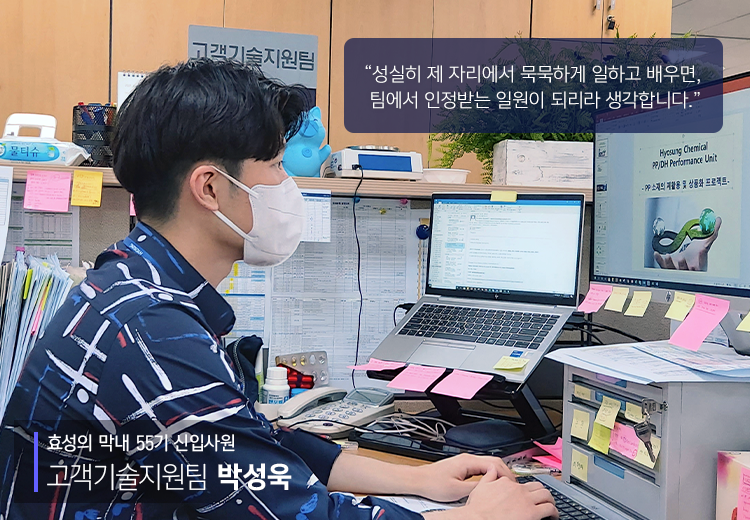 안녕하세요. 열정으로 가득한 신입사원 박성욱입니다. 저는 효성화학 PP/DH PU 고객기술지원팀 소속으로 고객의 제품 문의, 샘플 출고, C&C(Claim & Complain) 대응 등의 업무를 담당하고 있습니다.