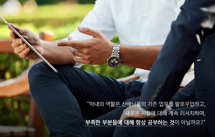 막내의 역할은 아무래도, 선배님들이 하시는 기존의 업무를 팔로우업하고, 새로운 시장에 대해 계속 리서치하며, 부족한 부분들에 대해 항상 공부하는 것으로 생각합니다. 막내로서 1인분을 해내기 위해 조급한 마음을 가지는 것이 아니라, 성실히 제 자리에서 묵묵하게 일하고 배우면, 팀에서 인정받는 일원이 되리라 생각합니다.