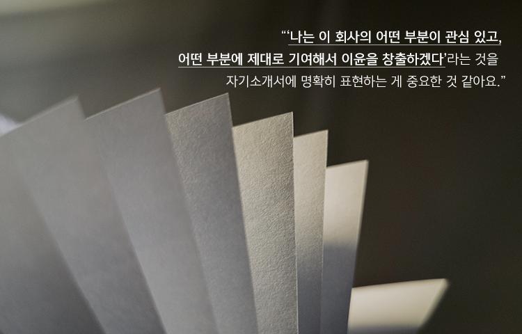 자기소개서는 서로 돌려 읽으면서 피드백을 받아 다듬었던 것이 서류전형 합격 비결인 것 같아요. 자기소개서에서 강조했던 부분은 ‘내가 이 회사에 왜 필요한가’인데요, 회사는 이익집단이기 때문에 투자 대비 수익을 얻어야 합니다. 이런 측면에서, 지원자가 단순하게 ‘나는 여러 능력이 있어’가 아닌, ‘나는 이 회사의 어떤 부분이 관심 있고, 어떤 부분에 제대로 기여해서 이윤을 창출하겠다’라는 것을 자기소개서에 명확히 표현하는 것이 중요한 것 같습니다.