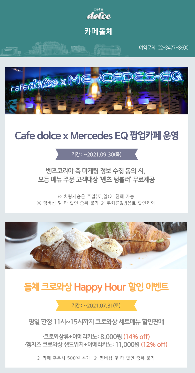 카페돌체는 9월 30일까지 메르세데스-벤츠의 전동화 자동차 전용 서브 브랜드인 메르세데스-EQ와 협업하여 팝업카페를 운영합니다. 벤츠코리아 측 마케팅 정보 수집 동의 시, 모든 메뉴 주문 고객에게 ‘벤츠 텀블러’를 선물로 드립니다. 주말에는 차량 시승도 하실 수 있으니, 한강 나들이도 즐기고 카페돌체 팝업카페도 꼭 들려서 구경해보세요.