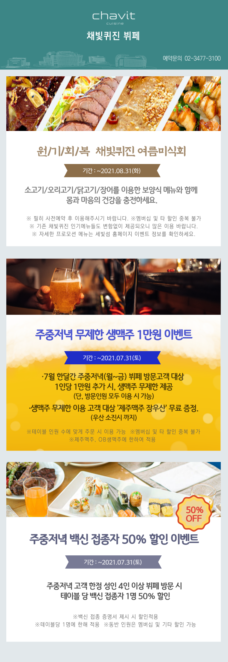 먼저 든든히 배도 채우고 기운도 채우며 시작해볼까요? 뷔페 레스토랑 채빛퀴진의 여름 밥상은 바로 원기회복 여름미식회입니다. 소고기, 장어, 닭고기, 오리고기 등 풍부한 영양을 자랑하는 신선한 재료로 특별하고 맛있는 다양한 요리를 준비했어요. 8월 31일까지 여름미식회는 계속되니, 복날에는 채빛퀴진을 찾아주세요.