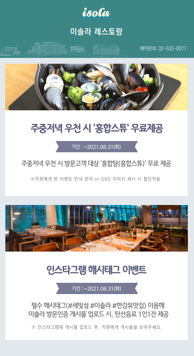 이탈리안 레스토랑 이솔라에서는 8월까지 무료 제공 이벤트로 여러분을 더 즐겁게 해드리려고 해요. 비 내리는 주중저녁 방문고객에게는 따뜻하고 풍미 있는 홍합스튜(홍합탕)를 무료로 제공해드립니다.