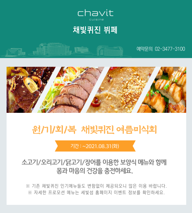 8월 31일까지 채빛퀴진 여름미식회는 계속됩니다. 7월부터 선보이고 있는 채빛퀴진의 보양식 메뉴가 여러분의 건강한 여름을 책임지고 있어요. 소고기, 장어, 닭고기, 오리고기 등 영양도 듬뿍, 맛도 일품인 요리들로 기나긴 여름을 무사히 보내시길 바랄게요. 이 밖에도 채빛퀴진의 기존 인기 메뉴도 변함없이 제공됩니다.