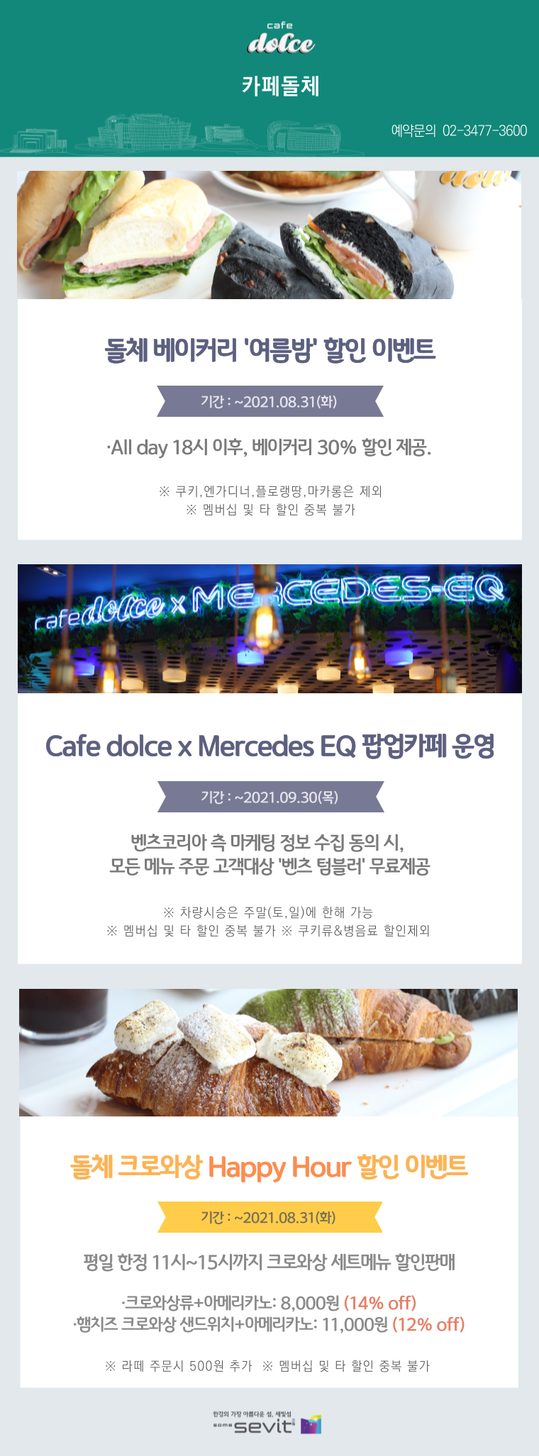 매일 저녁 6시 이후, 카페돌체 베이커리 30% 할인을 제공합니다. 간단한 저녁 식사로도 좋고, 다음날 브런치로 먹기에도 좋을 거예요. 또한, 평일 오전 11시부터 오후 3시까지는 돌체 크로와상 해피아워 할인 이벤트가 진행 중이에요. 크로와상과 아메리카노 세트를 할인하여 판매하니, 많은 이용 바랍니다.