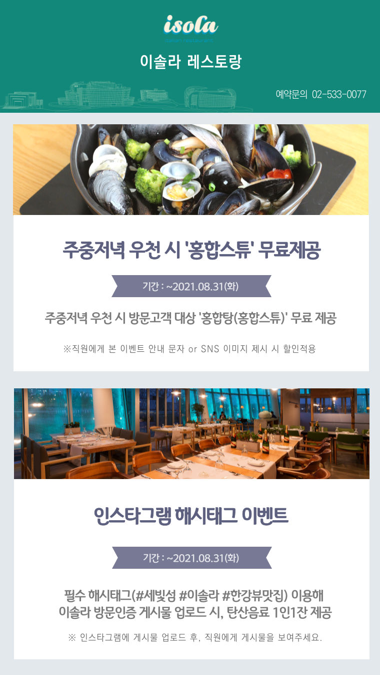 이솔라 레스토랑에서는 인스타그램 해시태그 이벤트를 진행합니다. 필수 해시태그(#세빛섬 #이솔라 #한강뷰맛집)로 이솔라 방문 인증 게시물을 올려주시면, 탄산음료 1인 1잔을 제공해드려요. 직원에게 게시물을 보여주시면 됩니다.