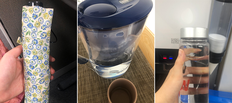 이번 도전을 하면서 한 번 쓰고 버리는 일회용품이 생각보다 참 많다는 것을 깨달았어요. 프린트도 불필요한 인쇄는 줄이고 꼭 필요한 경우에는 양면인쇄를 하려고 했더니 버려지는 종이도 현저히 준 것을 느꼈습니다. 하루는 비가 왔는데 약간 젖은 우산에 일회용 우산비닐 대신 우산집을 사용해보았더니 생각보다 보관하기 좋았습니다. 집에서도 페트병에 담긴 생수를 그만 사고, 대신 브리타 정수기를 구매해 사용하고, 운동 갈 때도 물통에 물을 담아 마셨어요.