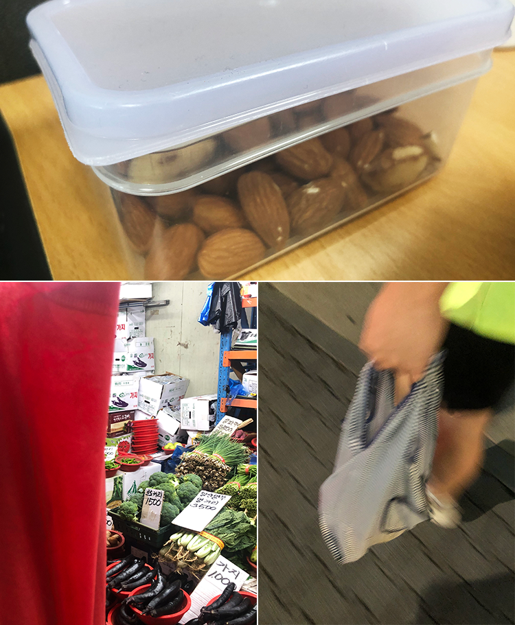 챌린지 첫날, 먼저 출근길 아침에 늘 마시던 아이스라테는 플라스틱 일회용 컵을 사용하지 않기 위해 텀블러에 담아서 마셨습니다. 그리고 물을 마시기 위해 사용하던 일회용 종이컵을 사용하지 않으려고, 커피를 다 마신 후 텀블러에 담아서 마셨죠. 가끔 회사에 간식으로 아몬드나 과일을 일회용 지퍼백이나 투명 비닐봉지에 담아서 가져가곤 했었는데, 작은 다회용 용기에 담아가기 시작했고요, 퇴근길에 들리던 시장도 장바구니나 에코백을 챙겨서 비닐봉지를 사용하지 않으려고 노력했습니다.