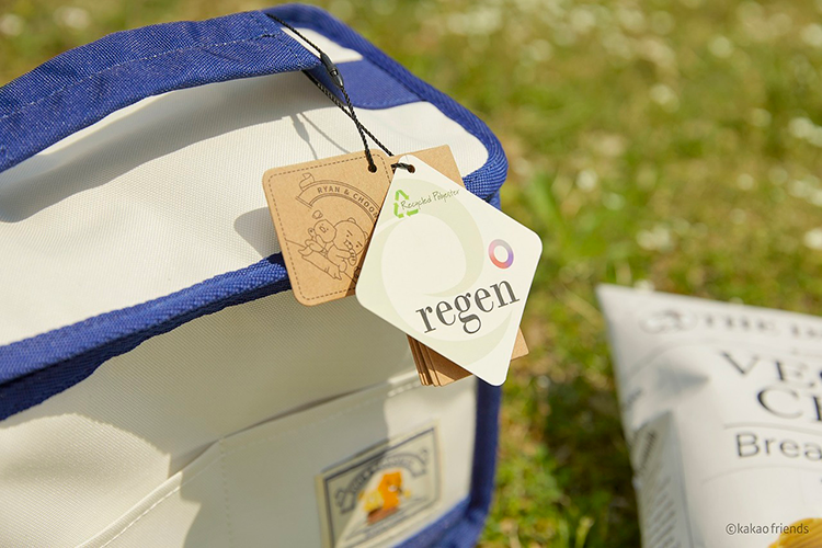 카카오프렌즈는 올해부터 원자재와 포장재 모두를 친환경화하고 있는데요, 그 첫 시도로 효성티앤씨의 ‘리젠’이 채택됐습니다. 프렌즈 그린라이프 보냉백은 재료부터 포장까지 친환경 소재를 이용해 제작합니다. 플라스틱 폐기물을 줄이기 위해 500ml 페트병 3.3개로 보냉백 1개를 만들고 제품을 친환경 비닐로 포장하죠.