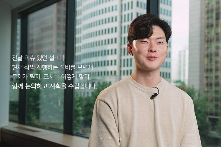 책임감도 중요하고, 업무 능력도 중요한데요, 무엇보다 멘탈이 단단한 분이면 좋겠어요. 일 잘하고 체력이 아무리 좋아도 멘탈이 무너져서 힘들어하는 분들을 많이 봤거든요. 모든 공정을 전부 다루는 업무 특성상 한 번에 여러 업무를 처리해야 하는 경우가 더러 있고, 야간에 갑자기 고장 난 설비를 긴급하게 조치해야 할 때도 있어요. 이때 당황하지 않고 침착하게 대처할 수 있는 분이면 좋을 것 같습니다.